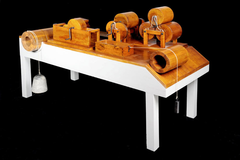 The exhibit consisted of four separate models, although these components all have the same MUST inventory number. The largest was the ‘worktable’, 1.88 m long, 0.81 m high and 0.85 m wide, which we shall call Model A. It supported at one end a rectangular wooden box attached to a string which passed over a cylinder (195 mm in diameter and 320 mm long) on an inclined plane to a hanging weight, and at the other end a horizontal cylinder (237 mm in diameter and 450 mm long) lying in a hemi-cylindrical cavity, again attached to a weight by a string. On the rear left corner of the table lay a wooden plank supporting a stack of shorter wooden blocks, of which one was attached to a long T-shaped handle. The view of these blocks is obscured in Figure 1(a) and they are not depicted in Figure 1(b). On the table also rested three separate devices: Models B, C and D. The models are all labelled in Figure 1(b).