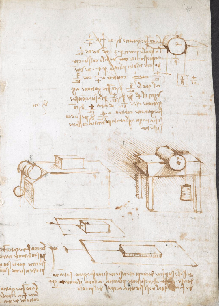 The ‘table’ of Model A is based on the two central sketches from Codex Arundel f. 41r (see Figure 3) and was first created (as Model A*) in 1939. These sketches date from 1500–1505[16] and show two separate and distinct pieces of apparatus. The notes written on the same page of the notebook, some of which extend on to the facing page (f. 40v), consist of a general statement on the origins of variation of friction, detailed quantitative attempts to evaluate the effects of friction on rotors carrying various hanging weights, and the statement ‘circular friction is equal to linear friction’[17]. But there is no text that relates explicitly or implicitly to the sketches on which Model A is based, and we must therefore interpret them in the context of what we now know about Leonardo’s investigations of friction (Hutchings, 2016).