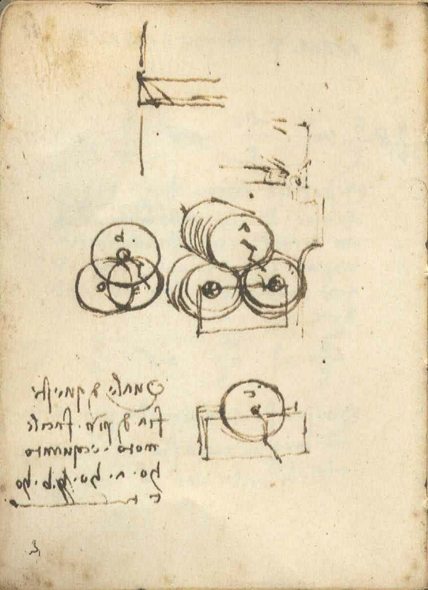 These three models, which were first produced for the 1953 exhibition, are based on a group of sketches in MS L f. 11v (see Figure 4) dating from 1497–1502 that show a roller or disc supported in three different ways, with a hand-crank drawn in each case to indicate the roller of interest. They are accompanied on the page by a rhetorical question comparing the ease of rotation for the three designs: ‘which of these is of easier motion, and how much: a or b or c?’.