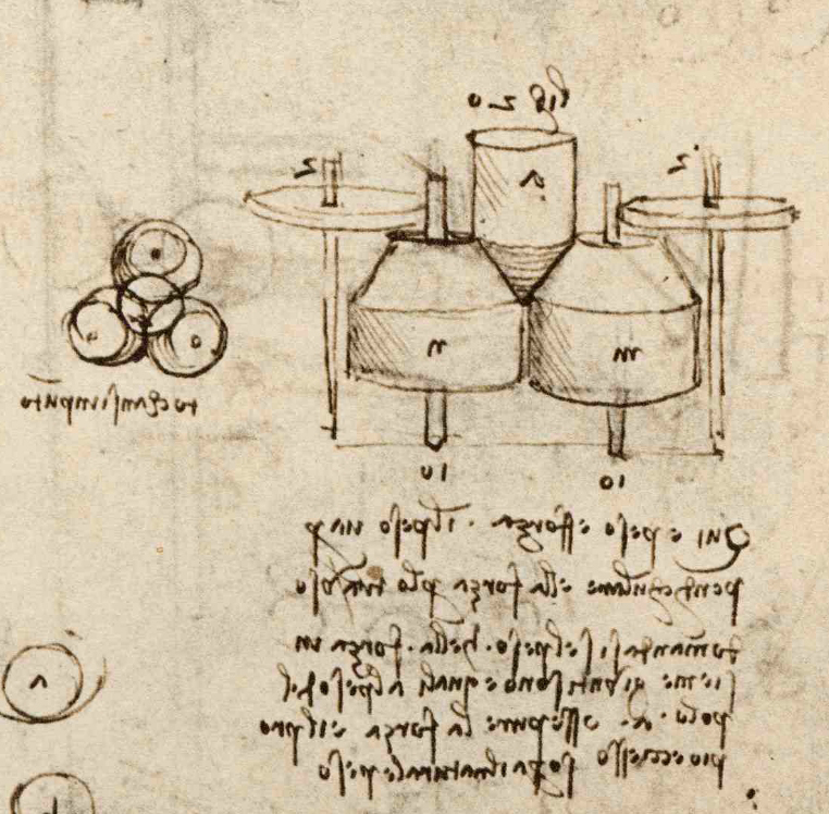 Canestrini’s own descriptions of the sketches behind Models B, C and D varied in his different publications: ‘studies of rolling friction’; ‘axles rotating on rollers’; and ‘studies of friction in axles’. None of these is accurate, as Leonardo’s own words that accompany the sketches make clear: what he was depicting was a comparison between three methods of supporting a roller, and he was asking which method caused the least resistance to motion. As with Model A, these sketches and the models derived from them do not show plausible methods for studying friction, either in sliding or rolling.