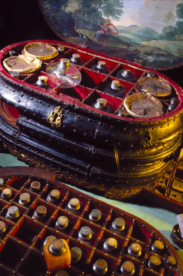 Whatever environment the chest was used in, and however it arrived in the ownership of the Giustiniani family in Italy, the construction and finish of the object indicate that this is a high status, high cost object. The lack of chipping and wearing, other than aging, of the gilding on the highly carved feet of the chest also confirm that this elite item has been cared for and was a prestige object to be looked after rather than stood on potentially damaging surfaces or mistreated.[4] Its exterior is covered in leather which, as Thomasin Summerford points out, was originally stained red to match the un-faded red velvet interior where bottles and boxes containing expensive medicinal material are securely held in individual cells to guard against breakages during transportation (Summerford, 3 May 2011, unpublished dissertation, p 90). Whilst this is a well-crafted and attractive object this is not a piece of furniture or a conversation piece. The materia medica, plant, animal and mineral ingredients from which medicinal cures can be created are really what is special about this object and why it was created for its original owner. It is very easy to be distracted by the object itself and assess it solely on its external value as an early modern piece of furniture. However, it is significant that its contents were more costly than the carcass, which merely acts to safeguard the expensive desiccated medicinal compounds and ensure that they are kept dry and secure.