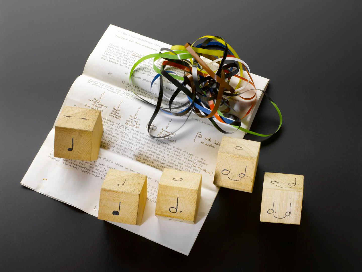 https://dx.doi.org/10.15180/170705/007From 1968 to 1975 Davies was a member of Gentle Fire, an ensemble that specialised in the performance of experimental music with live electronics (Davies, 2001; Mooney, 2016d). In 1970, Gentle Fire devised the first of six Group Compositions – pieces devised collectively by all the members of the ensemble, and described by the group as ‘environment[s] in which our […] group musical personality has a chance to resonate’ (Bernas, Davies and Robinson, 1973). For Group Composition II (1971), the six ensemble members produced ‘scores’ for each other, ‘which describe[d] the interaction and ensemble characteristics of playing together’ (Bernas, Davies and Robinson, 1973). These were not conventional ‘scores’ of Western classical notation; rather, they contained text-based instructions, graphics, and symbols, as well as tape-loops and other physical apparatus devised so as to shape the unfolding of the musical material. ‘[T]he individual parts,’ Davies later explained, ‘were composed as separate layers, without any of us knowing what the other layers would consist of’ (Davies, 2001, pp 58–59). Graham Hearn’s score for Hugh Davies – now part of the HDC (Figure 12) – comprised written instructions, a tape loop, and a set of five thick wooden pentagons whose sides were inscribed with musical notes and rests of various durations. The pentagons were to be arbitrarily arranged before a performance, such that they spelled out a rhythmic pattern of notes and rests. This was to be followed by Davies when applying live electronic transformation to the sounds produced by the other musicians on ‘two cellos, piano (interior), [and] electronic organ’ (Davies, 2001, p 58). Specifically, the rhythmic pattern was to be iteratively repeated by Davies (ostinato is the musical term), with periodic changes governed by the contents of the tape loop and the activity of the other players. The tape loop contained five different recordings of the sound of a telephone ringing, and was to be played silently throughout the performance, its volume raised only intermittently, ad lib. Whenever this was done, the telephone ring that happened to be playing at that moment determined which of the five pentagons had to be rotated, so that a different one of its sides – and hence a different note or rest value – substituted the old one. Whether the pentagon was to be rotated by one, two, three, or four faces was determined by what another member of the ensemble – assigned to that particular pentagon prior to the performance – happened to be playing at that moment: a high-pitched sound meant rotate the pentagon by one face; a low-pitched sound, two faces; medium-pitched, three; or if the performer was playing in several registers simultaneously, four. Thus, the five pentagons provided a variable score for Davies’s part in Group Composition II, which resulted in ‘a slowly evolving rhythmic cycle of electronic transformations (primarily filtering and ring-modulation) of what was played by the musicians’ (Davies, 2001, p 59).