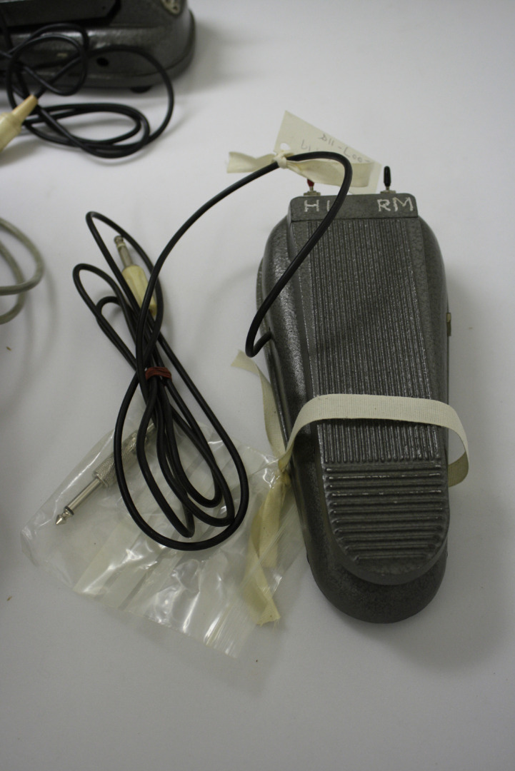 Another innovation prompted in part by Davies’s increasingly busy performance schedule was a set of three specially modified foot-pedals – now part of the HDC – which provided a compact and portable way of achieving live electronic sound transformation. The first of these pedals, constructed by Davies in 1970 (Toop, 1974, p 5), was a homemade ring-modulator ‘with a choice of two oscillators’ (Davies, 1997, p 14) housed inside the casing of a commercially-available volume pedal (Figure 9).[24]