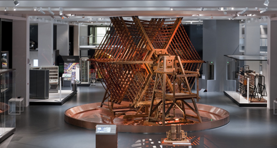 It was for this reason that the Information Age team tried to ensure that we included many representative examples of technologies that would normally have been concealed from the end users. The cluster of exhibits on The Cable included an exhibit facade that was covered in many different forms of cable, from early telegraph cables surrounded by gutta percha to telephone wires and thin fibre-optic cables. Other highlights of the gallery display are infrastructure technologies that have a big impact through their size or aesthetic, such as a hugeaerialtuning inductor from Rugby Radio Station (1943), an early Google ‘corkboard’ server (1998) that enabled the company to support web searches, an actual Eurostar 3000 communications satellite (2000) and the BBC’s first transmitter, 2LO (1922). We even commissioned a model of the Shabolovka radio tower in Moscow (1922) to show how the social and cultural trajectories of post-revolutionary Russia helped to shape the form of radio technology in the Russian landscape.