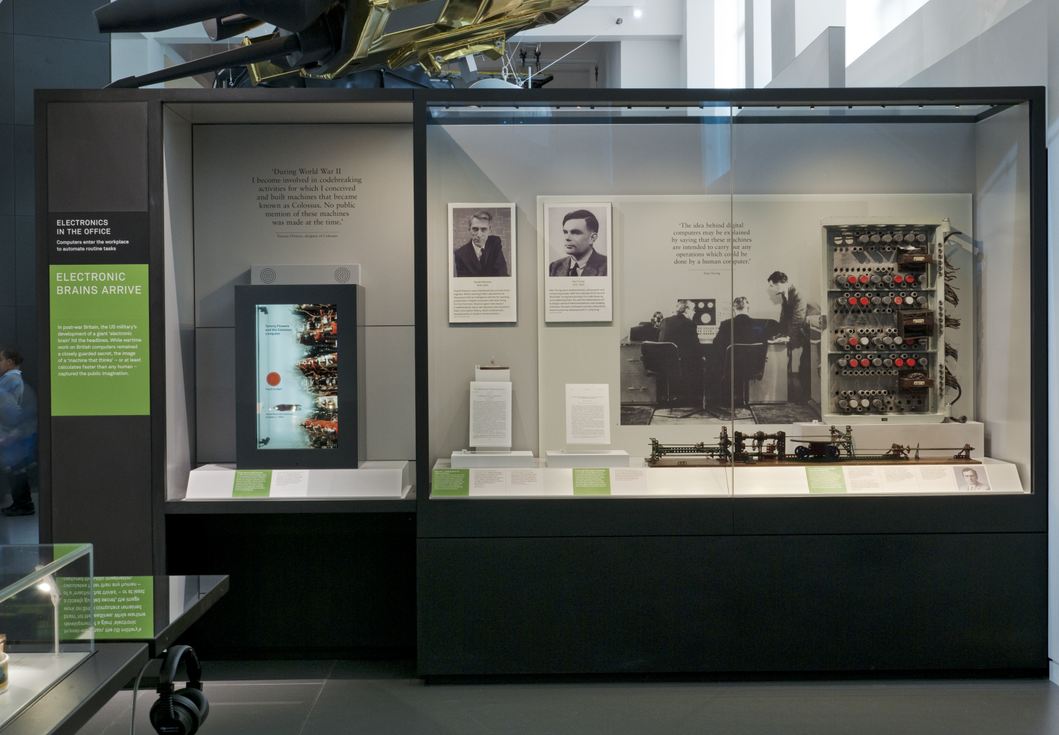 Acknowledging that both Turing and Shannon were central historical characters in the gallery, we chose to tackle this by viewing all of these concepts as socially constructed and therefore as legitimately understood through their human and personal history. For the Information Age team these seminal papers could be explored through the people and times in which they were imagined and through the subsequent technologies which rely on these initial ideas. We displayed the front page of the published papers, alongside objects from Bell Labs and Manchester University where Shannon and Turing respectively worked. Turing’s paper was placed near the Pilot ACE computer, the prototype computer which was based on Turing’s initial 1946 designs but completed in 1950 by another team.