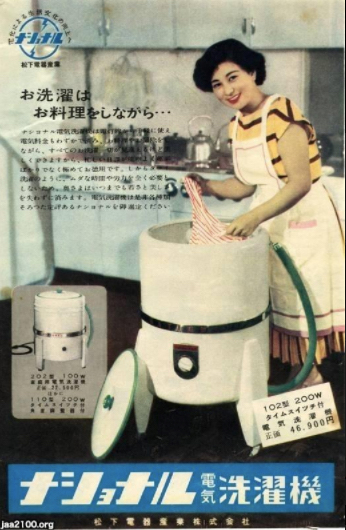 In Japan, the electric washing machine was seen as one of the so-called three sacred treasures – the others being the television and refrigerator – to be widely adopted in the late 1950s. The transition from manual to machine laundering was accelerated by the country’s adoption of mass-produced western clothes after the war (Suzuki, 2013). Widespread adoption of electric washing machines was facilitated by an expanding appliance industry, including companies like Sanyo and Matsushita that emphasised the benefits of new machines in enabling Japanese housewives to multi-task (see Figure 5). As an additional benefit manufacturers pointed out that the electric washer would eliminate the hardship of handling icy cold water to wash clothes during winter, as was the common practice (Suzuki, 2013). Spearheaded by the washing machine, Japan’s post-war electrification progressed rapidly. By 1960, more than fifty per cent of the country’s households owned washing machines, 45 per cent had black and white TVs and nearly twenty per cent had refrigerators (Nihon Enerugī Keizai Kenkyūjyo, 1996).