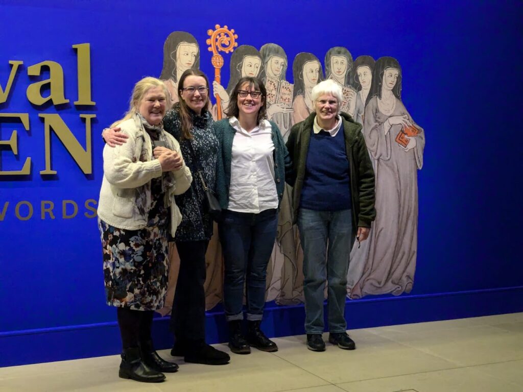 A group of us met Professor Louise Wilkinson at the British Library in London to visit the new Medieval Women exhibition there. Louise had been involved in creating the exhibition as a member of the advisory group, and they have done an excellent job. Interestingly, many of the manuscripts and documents on display have come from the British Library and The National Archives, with some from the Wellcome Collection and the V&A, as well as Oxford and Cambridge, and the Louvre in Paris, which is perhaps not surprising, but from a Kent perspective there was one very interesting panel showing the saints associated with Dartford Priory that came from Leeds Castle and is dated to the years before the dissolution of the Dominican nunnery. The exhibition is arranged thematically, such as topics relating to the body through medicine, anatomy and childbirth, and one of the exhibits is a birthing girdle. As you might expect, the majority of artefacts relate to the medieval Christian West, but there were some from much further afield, including gold coins from the first female Egyptian sultan from the mid-thirteenth century.