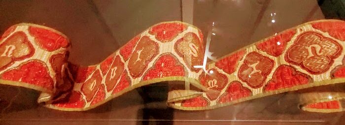 Nevertheless, the charter emphasises Matilda’s authority. As Harriet pointed out, “And then there’s the seal…” By using the traditionally round format for men it sends another message about Matilda’s adoption of traditionally more masculine forms of authority, because as we all agreed, “Women’s seals were usually pointed ellipses.” The detailing on the seal is really clear, too. It shows Matilda enthroned, with a sceptre and a three-pointed crown and the legend around the edge refers to her as Queen of the Romans ( + MATHILDIS DEI GRATIA ROMANORUM REGINA). However, the seal is not shown in the exhibition as a silk seal bag covers it. This seal bag of blue with woven yellow crosses may have been made from one of Matilda’s own robes, and it is a very rare survival.