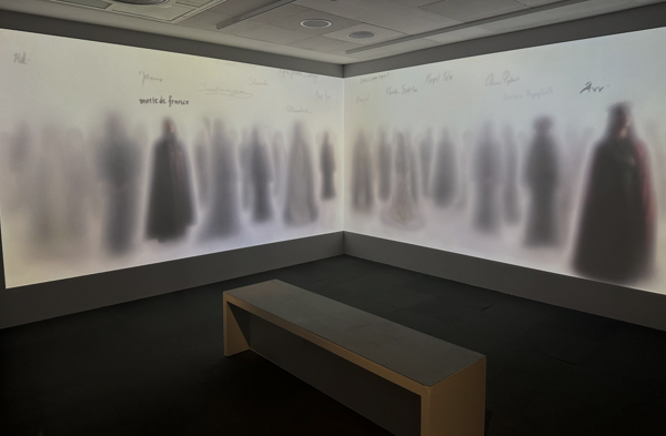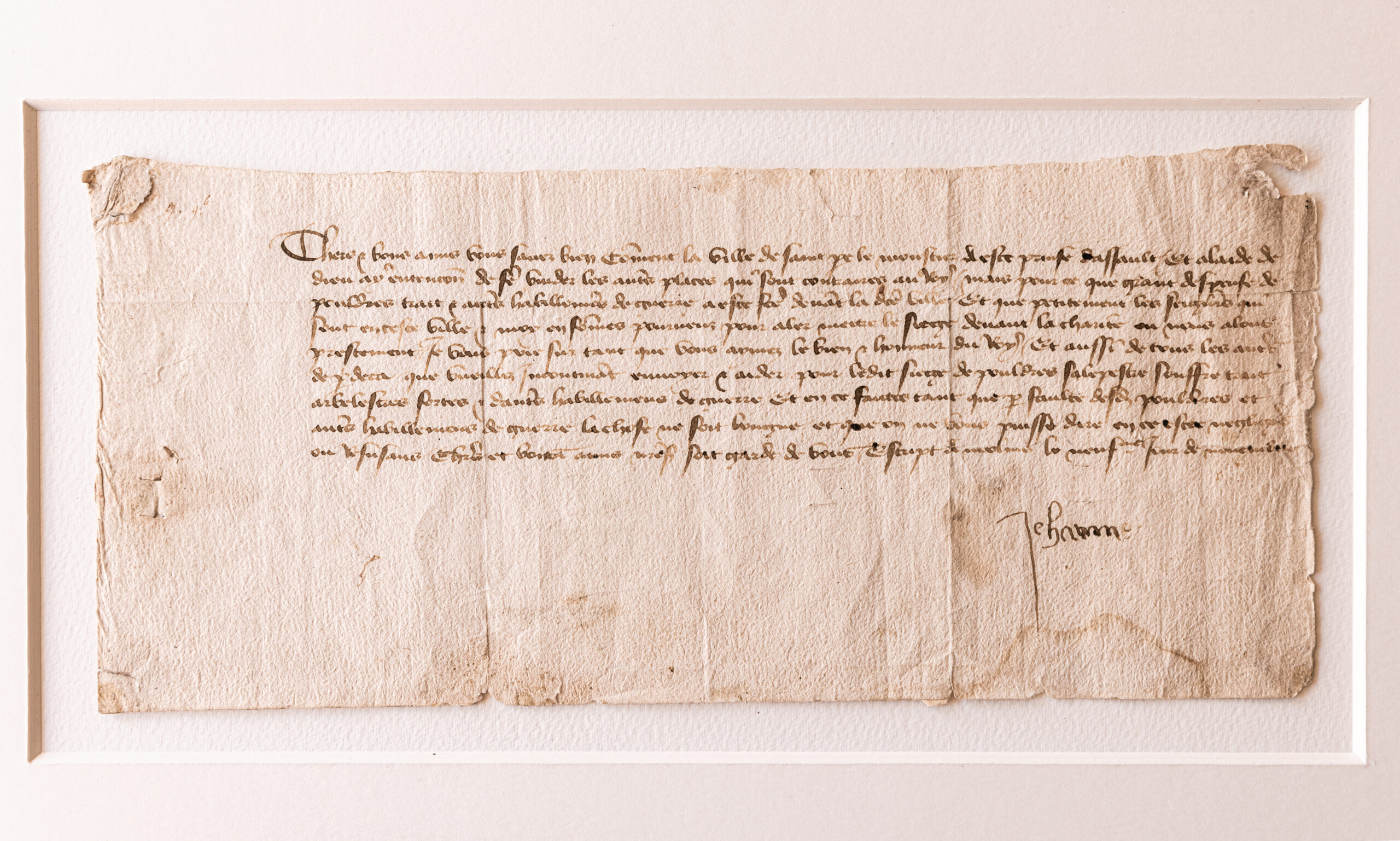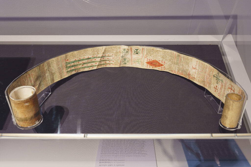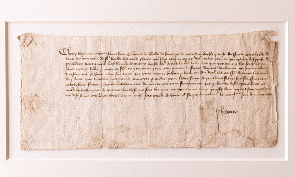 Opposite this sensory wall is perhaps one of the most significant artefacts in the exhibition: the earliest autograph signature of Joan of Arc, on loan from Ville de Riom, Archives Municipales. Joan dictated this letter (asking the citizens of Riom to provide gunpowder and military equipment) to a scribe, since she was illiterate, but the shaky signature ‘Jehanne’ is in her own hand. This poignant record of a woman aged only nineteen at her death carries in its uncertain letterforms an emotive mixture of both courage and innocence.
