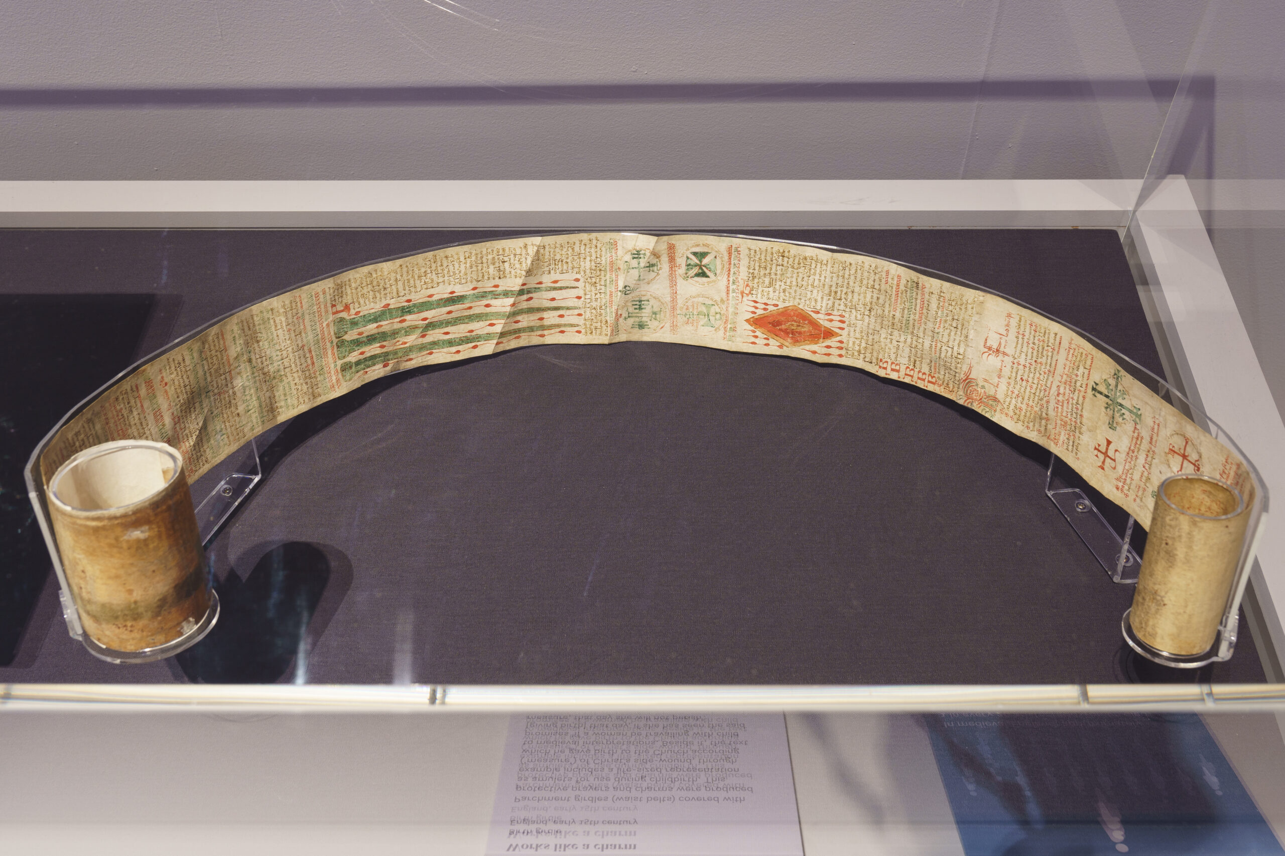 British Library manuscript Harley Roll T11 offers a more intimate, personal account of pregnancy. This long, thin parchment roll, now known as a ‘birthing girdle’, offered protective assistance against many potential hazards, including battle, sudden death, pestilence and childbirth. Among its devotional texts and images is an illustration of Christ’s Side Wound, which has been touched or kissed devoutly to such an extent that the pigment has worn away completely in the centre. As the name ‘birthing girdle’ suggests, this manuscript could also have been worn as a girdle or belt, wrapped around the body in a pregnancy or labour context. Rolls and scrolls often end up flattened when on display, but this birth girdle is displayed in a curved setting, highlighting the dynamism and materiality of the object.