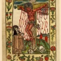 Many of these religious prints were hand-coloured and some were decoratively sewn in with brightly coloured silk threads, a meditative creative process that highlights the centrality of textile practice in medieval religious culture. A fourteenth-century embroidered altar band made as an act of devotion is even signed by its maker: ‘Lady Joan of Beverly, a nun, made me.’ This extraordinary textile work of exceptionally high quality, on loan from the Victoria & Albert Museum, is the only surviving piece of medieval English embroidery to record its maker’s name.