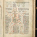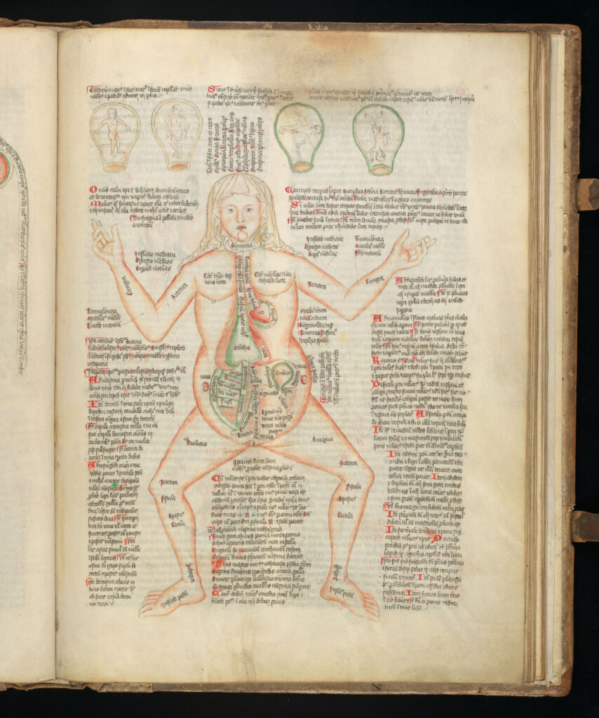 She faces the viewer directly, her modestly wimpled head in stark contrast to her exposed, naked body. In a culture that depicted (typically white, able-bodied) male figures as universally representational for medical diagrams, the ‘Disease Woman’ provides an alternative perspective, illustrating information specific to women’s bodies. Notable among her illustrated internal organs is a uterus, labelled ‘Embrio’ – she is pregnant.[3]