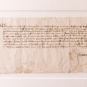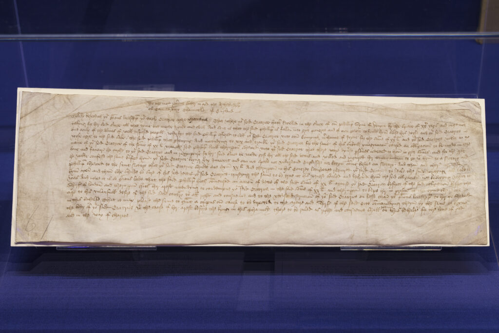 It is in the next section, ‘Public Lives’, that the exhibition explores more fully the themes of power, inequality and exploitation. Women sought power and influence in numerous ways, from across the whole social spectrum. An account of the Peasant’s Revolt in Cambridge records the protesting voice of Margaret Starre, an old woman whose livelihood was threatened by the privileges of the University. She holds equal space next to Empress Matilda, who nearly became the first ruling queen of England – the foundation charter of Bordesley Abbey styles Matilda as ‘empress’ and ‘lady of the English’, and her unusual round seal[4] depicts her with both crown and sceptre (Foundation Charter, Bordesley Abbey). Dated to 1141–1142, the charter was issued by Matilda during a bloody civil war, when nobles led by Stephen of Blois refused to accept Henry I’s daughter as their ruler.