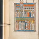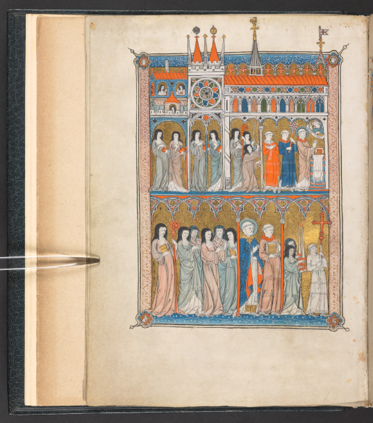 The large introductory image for the entire exhibition comes from La sainte abbaye (France, c. 1290–1300), a treatise on the ideal abbey, showing a detail from a full-page miniature depicting the Abbey and its Cistercian nuns going in procession to mass clutching their choir books, led by their abbess with her crozier. These are personifications of a nun’s virtues, rather than real medieval women.