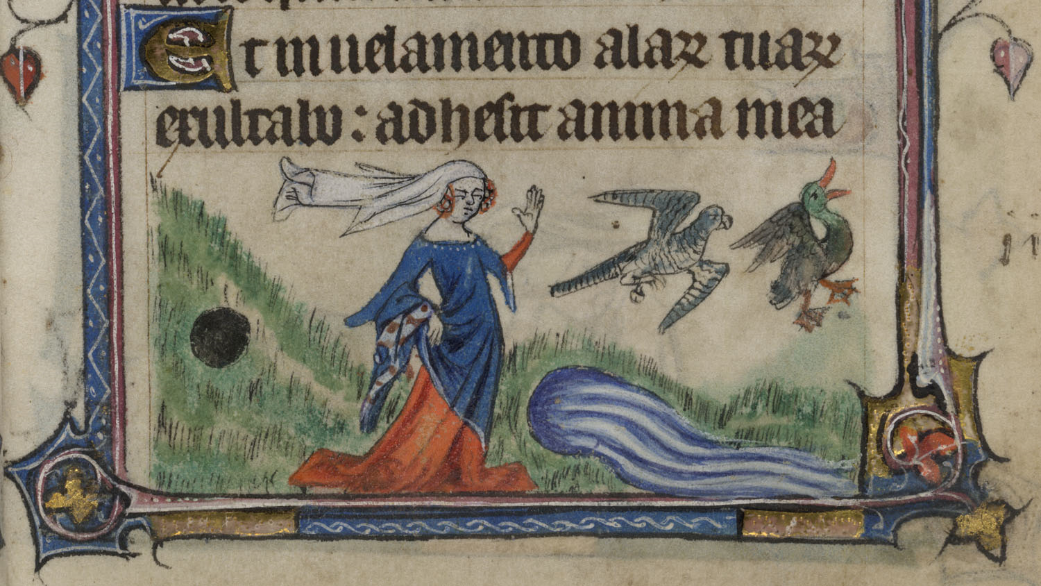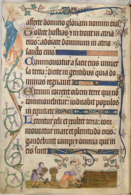Besides this harvest scene, there are other telling images in this Psalter depicting women at everyday work. For example, milking sheep, feeding poultry, tending the fields, spinning, taking grain to the mill, and carrying heavy loads.