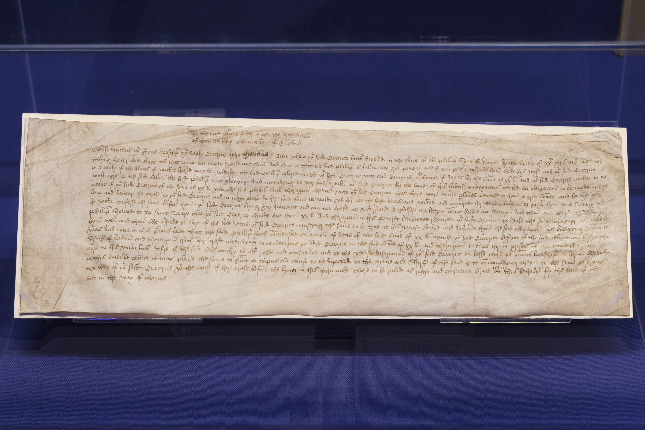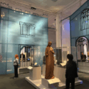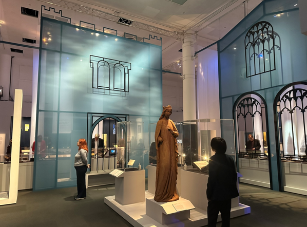 The room opens out suddenly, offering the first view of the exhibition. It is airy and spacious, almost as if entering a cathedral; standing at the top of a flight of stairs, visitors overlook a space demarcated by architecturally styled fabric divisions indicating house, castle and church, and wide lengths of cloth hanging from the ceiling. The soft, warm lighting and calm, blue tones of the fabric are inviting, encouraging visitors to descend the staircase, where they are met by a life-sized replica statue of Queen Eleanor of Castile (1241–1290). Eleanor was the beloved consort of King Edward I, whom she had married when aged 13. After she had died aged 49 on 28 November 1290, Edward set up impressive stone crosses decorated with heraldic shields and statues to mark the route of her cortege from her place of death in Harby (Northamptonshire) to where her body was interred at Westminster Abbey. Her entrails were entombed in Lincoln Cathedral.