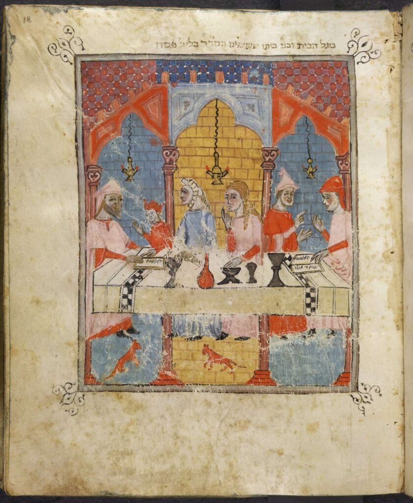The next section, ‘Family and Household’, demonstrates the diversity of domestic life for medieval women. Despite the inequality of education and legal rights, women’s testimonies show that their roles were often active and vibrant. A primer from c. 1445 illustrates a classroom scene with four young girls, and two alphabets on the facing page; a Hebrew prayer book from 1469 contains various illustrations of a young woman performing Jewish rituals (the Sister Haggadah from Eastern Spain). Both manuscripts make it clear that some women could be highly educated and actively involved in religious ceremonies – even when those roles were usually assigned only to men.