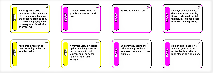 These early explorations proved that the game was a simple yet effective concept and inspired us to develop a more sophisticated educational resource, re-named Mind-Boggling Medical History. While intentionally bringing to light amusing and curious ideas from medical history, the game had serious objectives: to inspire discussion about the differences between past and present ideas, and to get people thinking about what is ‘current’ and who decides this. The inclusion of the fictional category added a twist to the game, showing how it is not always easy to distinguish fact from fiction when it comes to medicine, highlighting the role of the unexpected and unlikely in medical practice. Moreover, unlike fictional theories, past practices have had real effects on patient care, and are sometimes even rehabilitated after being previously discredited. This is illustrated, for example, by the card statement ‘leeches are used to prevent soft tissue from detaching from the face in reconstructive facial surgery’ (a present-day practice), which can be used to open up conversation about the recent resurgent interest in the ancient medical method of leeching. The game thus reminds the audience that the categories are not set in stone, and that best practice in medicine and healthcare is constantly re-evaluated.