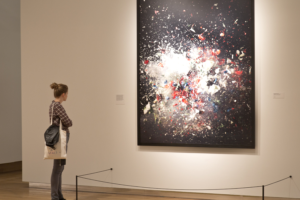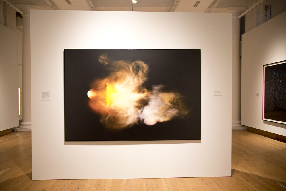 The contemporary art projects in the exhibition marked a further shift in tone. In the work of Trevor Paglen, viewers were shown the night sky not to revel in its beauty or to learn about the stars, but to note the presence of surveillance satellites and military drones (Paglen, 2010). Clare Strand’s photographs presented ironic motion studies of a post-industrial workforce, typing emails, reading Easy Living catalogues, banging heads against brick walls (Drew, 2008). Walead Beshty’s abstract-looking images were produced when unexposed film reacted with X-ray security scanners at airports. Sarah Pickering’s large-scale photographs used the muzzle flash of a firing revolver to create an image, in ways designed to probe the thin line separating beauty from violence. Each, in its own way, gestured towards the instrumentalisation of earlier scientific discoveries as mechanisms of violence, surveillance and control. All took up the mounting ambivalence expressed by artists across the twentieth century as a conscious and overt theme.