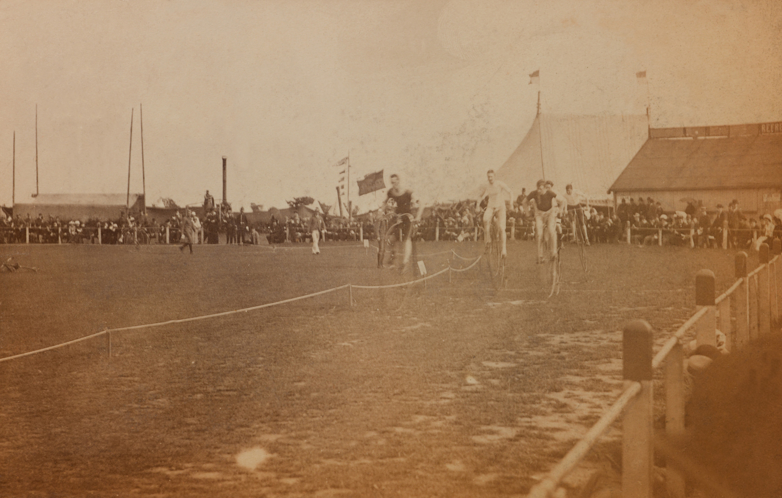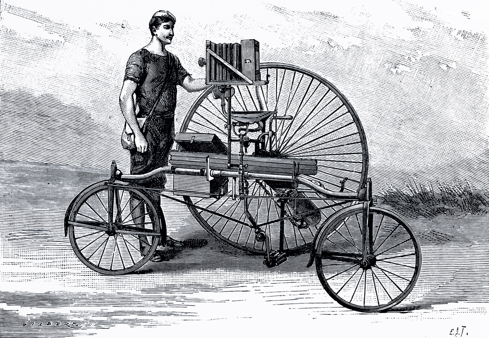 https://dx.doi.org/10.15180/191204/002While the earliest attempts at carrying a camera on self-propelled wheels date back to the late-1860s,[10] this activity acquired a broader appeal amongst the middle classes only in the mid-1870s, when cycle technology developed a fundamental modern feature: speed (Herlihy, 2004). With vehicles that could now go faster and further afield, the bicycle became part of modern life in a way that transcended its merely functional use as means of transport. First with cycle racing, and by the close of the 1870s with cycle touring too, the bicycle developed a new distinctive cultural significance. A key reason for this, as we will see, was that it offered new ways of adapting the physical self to the modern world by extending the capabilities of the human body, and thus its perception of and engagement with space. By the mid-1870s the high-wheeler (also known as the ‘ordinary’ or penny-farthing) had become the standard bicycle in Britain regardless of the fact that it was dangerous to ride. The main reason for its popularity was that it was fast, much faster than its predecessor, the velocipede. The high-wheeler was particularly favoured by athletes, and cycle racing quickly became a popular public spectacle.