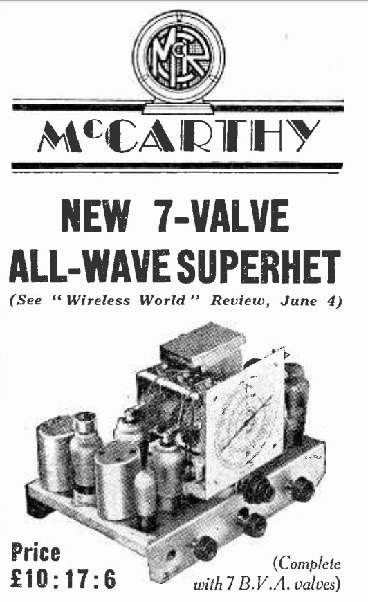 McCarthy was a regular advertiser in the paper during this period (indeed, perhaps the most regular in the period 1936–8) and two weeks later (18 June 1937, p 589; Figure 3) the firm capitalised on its review by beginning a run of advertisements for the model. The second most expensive in their range (£10 17s 6d, very roughly £500 in today’s money), it was pitched in exactly Large’s phrase: the ‘NEW 7-VALVE ALL-WAVE SUPERHET’. ‘Superhet’ was a term much bandied about in advertisements, though it is not clear that ordinary consumers had any idea what it meant. In long form (super heterodyne) it spoke of science; as a portmanteau term, of the even more modernist science fiction. Occasionally it was rendered as ‘supersonic heterodyne’ (Wireless World, 17 January 1936, p 63), a term that was even more impressive but made little sense since the different (hetero) frequencies that are combined are not in the auditory (sonic) range. A reader of Wireless World lamented its verbal allure: ‘My deep regret is that the public permitted themselves to be swept off their feet with the term “superhet”’ (28 May 1937, p 525).