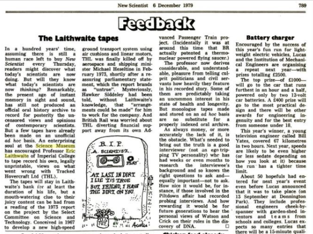 This was a lost linear motor, previously only known through a Wheatstone patent. Laithwaite confirmed it was undoubtedly original and together the two men made it operational (it was a different era of collection care, where historic objects like these were often operated). Brian recognised that this was material proof that Wheatstone invented the linear motor in c. 1840, and it formed a chapter in Brian’s 1975 biography of the scientist. In these and later years, Brian supported Laithwaite as he went through a difficult period in his career, following the cancellation of a major hovertrain project in the UK. The hovertrain was based on linear motor technology that was later exploited in Germany and Japan as Maglev (a term derived from magnetic levitation). In his will Laithwaite left Brian a series of audio tapes detailing his account of the controversial and widely publicised cancellation of the hovertrain project involving then transport minister Michael Heseltine. He was told not to make these public until after Heseltine’s passing. Brian would author Laithwaite’s obituary.[1]