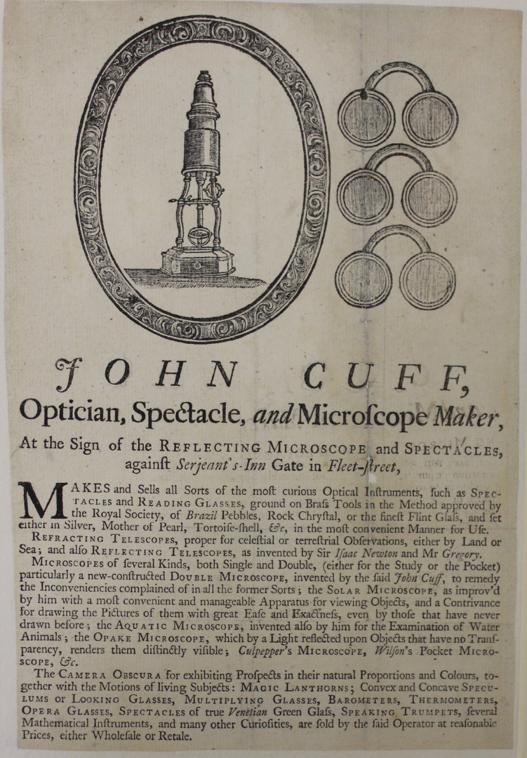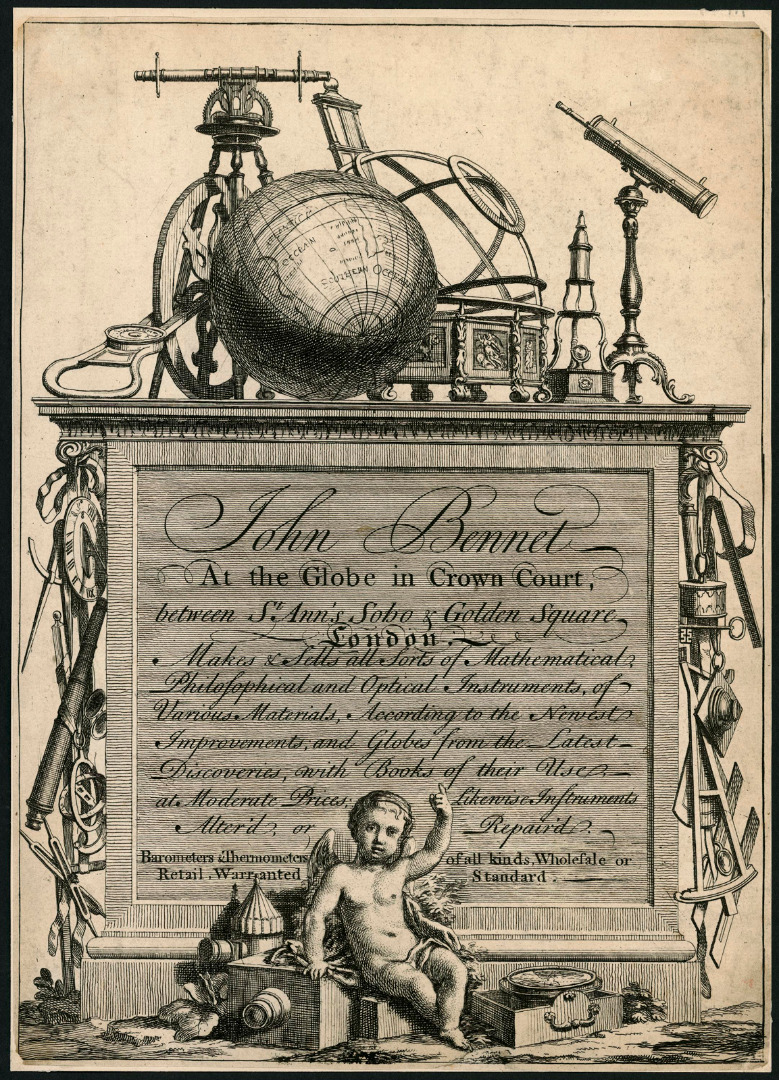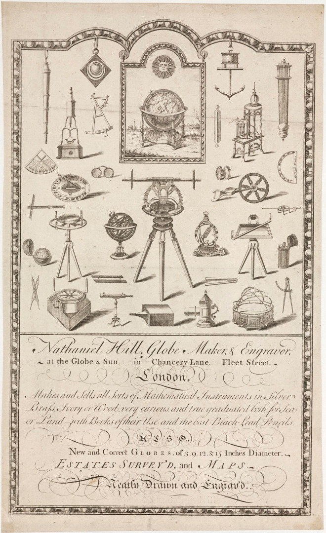 It was natural that skilled lens-grinders, as the optical instrument makers were, would turn their hand to any instrument that could be assembled using their skill-set, regardless of its field or application. If we consult the trade cards for different manufacturers we see a plethora of different instruments and devices. John Cuff of Fleet Street (see Figure 1) advertises reading glasses, refracting and reflecting telescopes, several different microscopes, barometers, thermometers and speaking trumpets. John Bennet of Crown Court (see Figure 2) advertises microscopes, telescopes, rules, globes, sundials, theodolites and compasses, among a jumble of other instruments. Nathaniel Hill of Chancery Lane (see Figure 3) advertises a similar range of professional and analytical instruments and announces that he ‘makes and sells all sorts of mathematical instruments in silver, ivory and wood, very curious and true graduated for sea or land, with books for their use and the best black-lead pencils’. Many of the items on offer would have been bought in for retail, but each maker would also have maximised their own manufacturing skills to produce all kinds of different instruments.