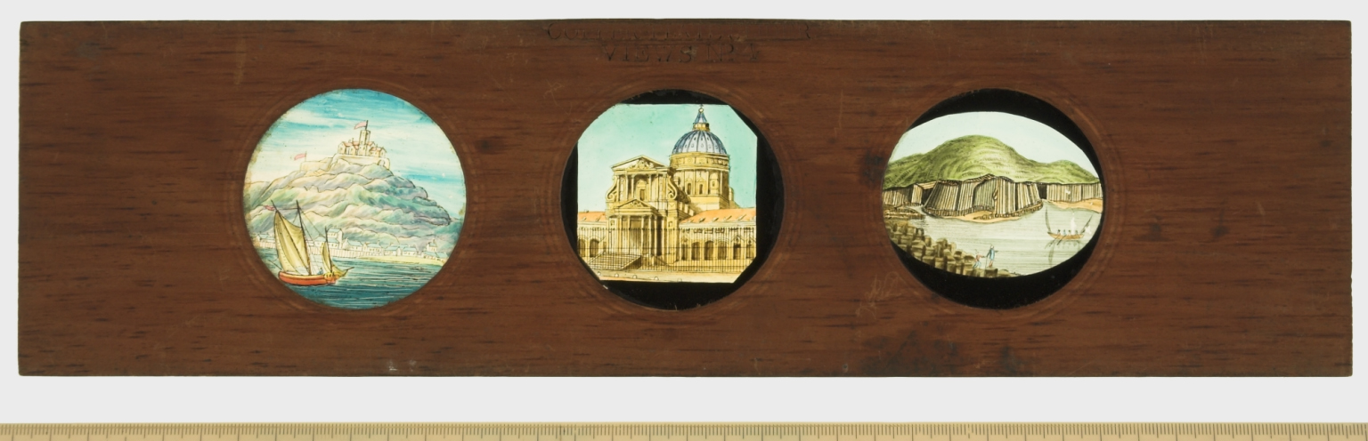 The Copper-Plate Sliders are made up of three or four transfer-printed and then hand-painted images on small glass disks, mounted in long wooden frames and secured with wire spring fixtures. These slides were the first to be printed from a single matrix (in this case a copper engraving). Carpenter’s copper-plate transfer process was based on the ceramic transfer process used by Sadler and Green from 1756 onwards (see Figure 23).