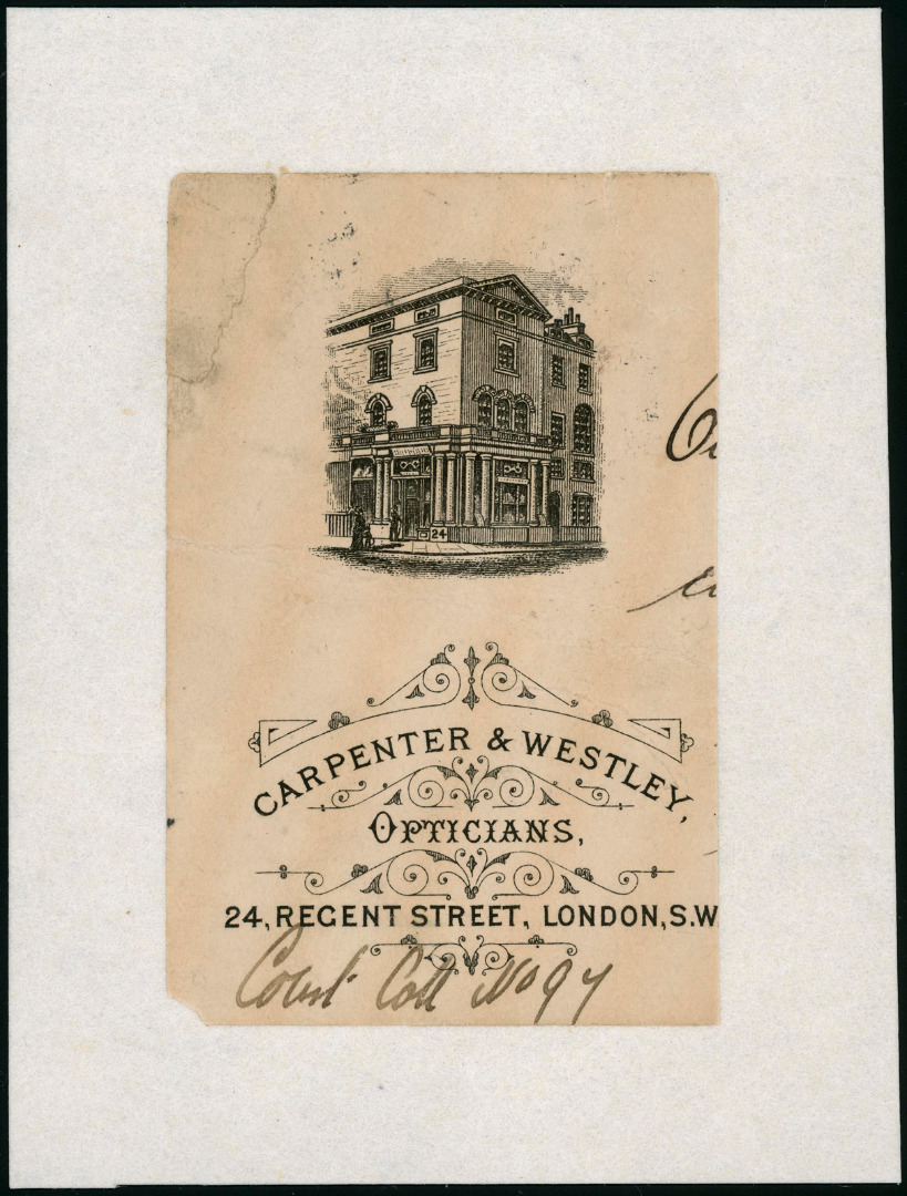 By 1826 Regent Street was the one of the centres of the consumer fashion world (Adburgham, 1979, pp 98–107). For a manufacturer like Carpenter it could act as a gateway to an increased retail market and greater prestige. It is likely that he was already shipping goods to London for sale. We know that he was sending instruments to Liverpool and Bristol (Liverpool Mercury, 1822, p 327; Morrison-Low, 2007, p 225), and that he had supplied telescopes to the Dollands of London (Timmins, 1866, p 534), using one of the many Birmingham goods carriers. Moving to Westminster made business more efficient, allowing Carpenter to sell to this market directly, without need of other instrument sellers to act as point-of-contact salespersons. As Carpenter’s fame grew, he would have received increased orders from the London market. His relocation to Westminster suggests the importance of the local consumer fashion market to his business model, and shows him taking steps to expand his potential customer base.