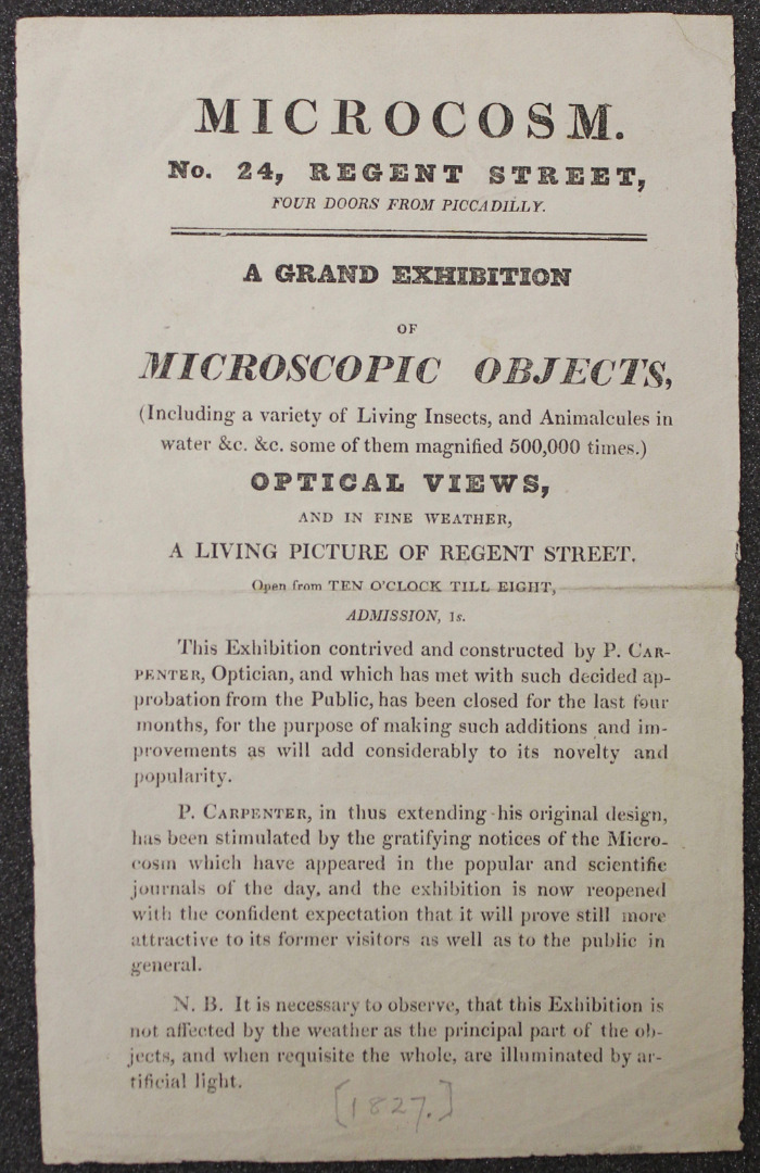 An announcement in The Morning Post in June 1827 shows that there were initially twelve microscopes, exhibiting ‘the wonders of nature on a magnitude never before attempted’ (1827). This was later expanded to fourteen, as a later advertisement shows (see Figure 25) and supported by various other effects and multiple compound microscopes. The microscopes were powered by the Sun during the day, but gas-powered after dark, giving continuous projections from eleven until eight each day. Visitors would view enlarged cheese-mites and aquatic creatures. An advert in The Morning Post says that ‘a single drop of water, filled with innumerable living creatures, occupies a space nine feet in diameter’ (1830). Carpenter again published a companion booklet that describes the different objects on view. Companion to the Microcosm lists seven transparent insects, five worms and 49 opaque objects, including beetles, earwigs, locusts, fleas, corals and lizard skin. These were varied regularly in the fourteen available microscopes.