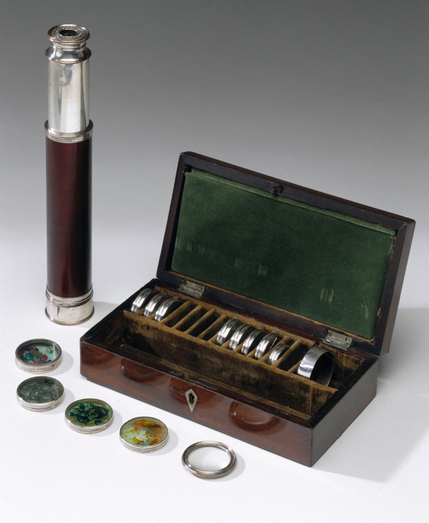 Early kaleidoscopes are all similar in design, but may have two functions. As per our usual expectations of the instrument, a kaleidoscope could be fitted with an object cell (filled with coloured stones and fragments) to produce kaleidoscopic patterns; or it could be fitted with a lens to view external objects, reflected into kaleidoscopic patterns. They were sold with and without object cells. In A Treatise on the Kaleidoscope Brewster explains how he had first designed a version with permanently fixed coloured glasses, which was pleasing but produced no sustained interest. He added means of rotating and interchanging the objects, which gave variability to the patterns, and, later, a draw tube and convex lens to allow viewing of external objects; so that, as Brewster says, ‘the images of objects, of all magnitudes and at all distances, might be distinctly formed at the end of the reflectors, and introduced into the pictures created by the instrument in the same manner as if they had been reduced in size and placed in the true position of symmetry’ (1819, p 6). These versions were called ‘telescopic kaleidoscopes’, and are not commonly known today. They follow the same principle as a pocket draw-telescope, with lens and sliding mechanism to focus objects, but fitted with inclined mirrors in the manner of the kaleidoscope.