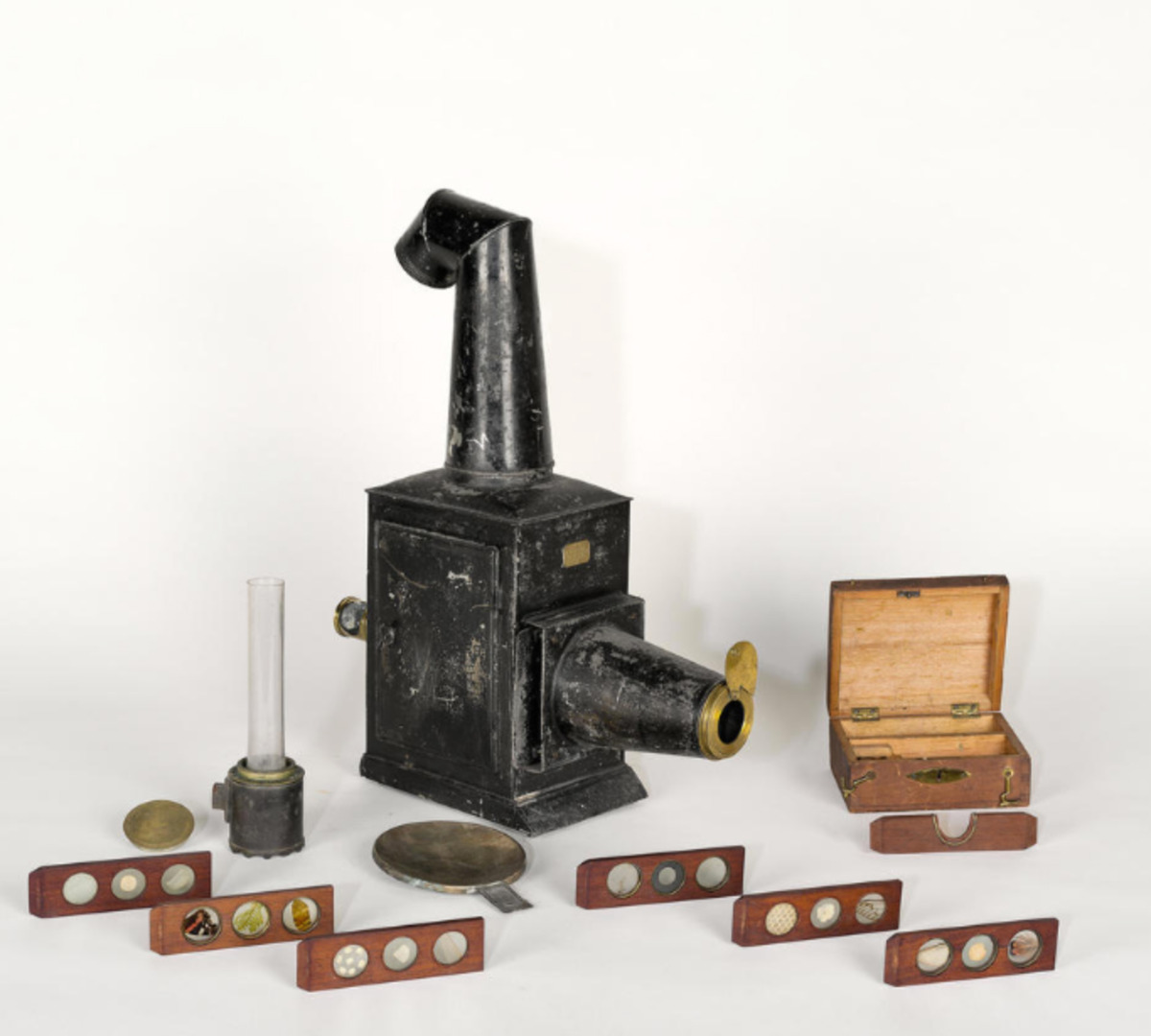 Carpenter’s lantern was made of tin, with a tall chimney that angled part way up, to protect its argand lamp from draft and to stop light escaping. It had a (sometimes adjustable) lens tube, with double condenser and objective lenses, and a diaphragm to prevent spherical aberration (Barnes, 1997, pp 19–20; Carpenter and Westley, 1850, pp 56–65). It was a significant improvement on earlier models because of the clarity of images produced (due to the arrangement and quality of its lenses), its overall simplicity and cheapness of manufacture. The most common lanterns had tended to use a single-lens bulls eye arrangement rather than the double-convex arrangement of Carpenter’s design (Carpenter and Wesley, 1850, p 56) and were more difficult to focus. The simplicity of use meant that Carpenter could target a non-professional clientele and prompt amateur users (teachers, preachers, gentlemen scientists, etc.) to take up the lantern as a useful way of presenting images in public.