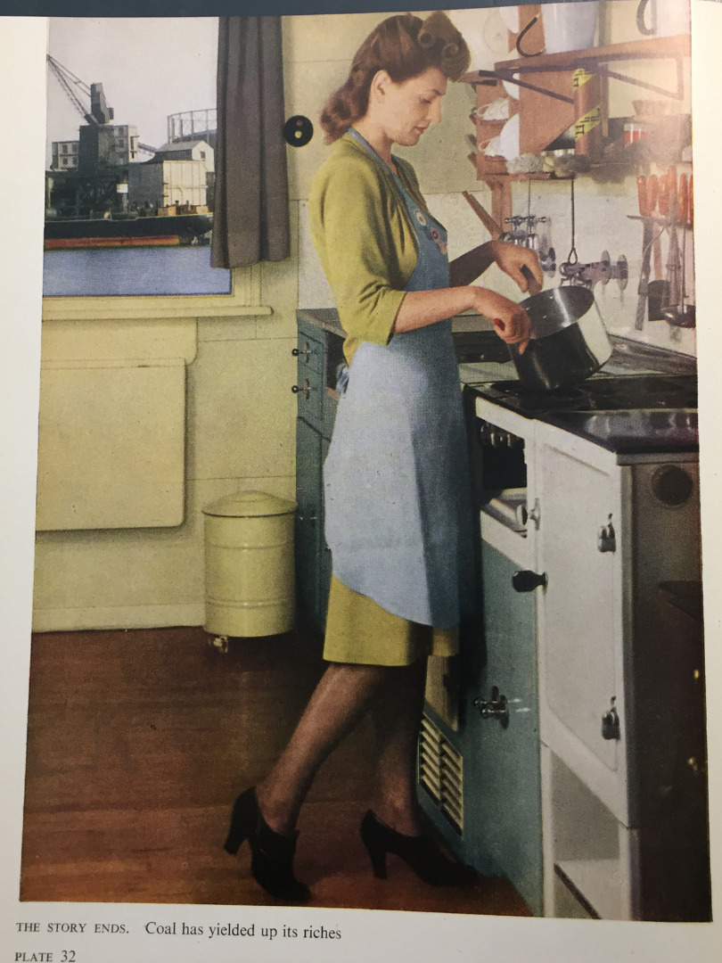 By the late-1940s a number of new council developments had been completed, which offered more space, better facilities and different forms of heating. In 1947 the Scottish writer Compton Mackenzie published The Vital Flame, a paean to gas, commissioned by the British Gas Council. Illustrated with 42 colour photographs, it celebrates the industrial, agricultural and domestic uses of gas power. Mackenzie describes a visit to a municipal block of flats, Kensal House in London, which provides ‘smokeless homes’ and is visited by architects and planners from all over the world (Mackenzie, 1947, p 34; see also plates 8, 28 and 32). Individual flats have gas cookers and water heaters and a ‘gas-ignited coke fire’ provides a cosy, but smokeless, fireside glow. Colour plates show the uniform, geometric lines of the exterior, as well as interiors such as a living room with slippers warming by the fireside (see Figure 1). The final plate is captioned: ‘The Story Ends. Coal has yielded up its riches’ and shows a woman cooking with gas and colour coordinated with her modern fitted kitchen, with a view of a gas power station through a window behind her (see Figure 2). The wealth that coal yields is gas.