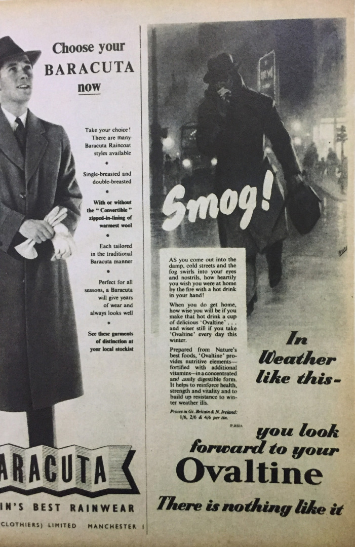 According to the American sociologist and philosopher Lewis Mumford, the Paleotechnic world of iron and coal would be replaced by the Neotechnic world of light, colour and synthetics but post-war Britain existed in the interstices of both phases of development (Mumford, 1955). No one made use of these images and developed them more effectively than the advertisers. What better way to evoke the consuming comforts of home than through their contrast with the chilly chiaroscuro of the city? In the winter months, hot drink products such as Ovaltine and Horlicks, Bovril and Cadbury’s Drinking Chocolate, ran advertising campaigns linking their brands with the restorative values of home. In December 1953, Ovaltine drew on the experience of the Great Fog with an atmospheric black and white image of a man hurrying home through a damp, dark street: ‘Smog! As you come out into the damp, cold streets and the fog swirls into your eyes and nostrils, how heartily you wish you were at home by the fire with a hot drink in your hand!’ (see Figure 6).[7] The imagined family he is rushing home to is as vivid as the choking damp air of the winter street but a few years later Ovaltine shifted its focus and depicted the world on the other side of the front door: ‘Ovaltine Families Are Happy Families’ (see Figure 7). Well-dressed, well-furnished and boisterously happy, this is the world of the domestic fireside, the safe haven from the storms brewing outside. There was, however, a more troubling possibility that the advertisers dared not hint at: perhaps the storms were not only outside the home but were also inside, creating conflict that not even Ovaltine could ease?