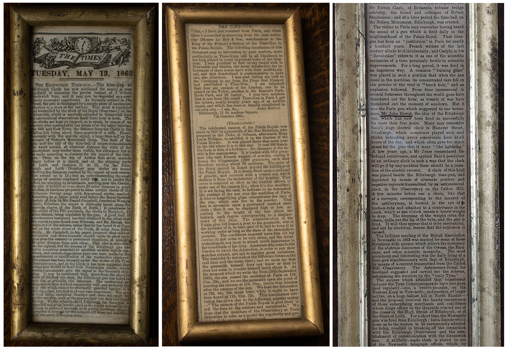 The Museum of Edinburgh model illustrates a mechanism that turned out not to be adequate in practice. It is not, therefore, a representation of the Edinburgh system, yet the object is tied closely to the Edinburgh context by the framed texts (Figure 4). In these, the Chamber of Commerce and the name John Hewat are prominent. One was a letter to the editor by Hewat; one notes him as the ‘originator’ of the time gun and, on the last, his name is underlined in pen (Hewat, 1863; Anon, 1862a; Anon, 1865). In the letter, Hewat shared an account of what had given him the idea for an audible time signal: a sundial at the Palais Royal that fired a miniature cannon at noon by focusing the Sun’s rays through a burning lens.[7] The miniature brass cannon in Hart’s model forms a link between the original inspiration of Hewat’s campaign and the realisation of an electric trigger.