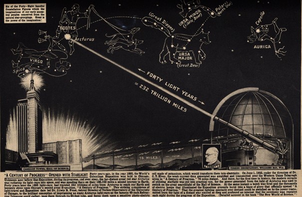 The photoelectric relay, with the accession number G-34a in the Adler’s collections, was used in a stunt performed during the official opening of Century Progress, and allegedly every evening for the whole duration of the fair (May–November 1933, then May–October 1934). The stunt consisted of switching on the fair’s lights using starlight captured at Yerkes Observatory (with three other observatories serving as a back-up) with a photoelectric cell attached to the Yerkes’s 40-inch refracting telescope (Figure 2). The resulting electric signal was relayed to the Century of Progress grounds via telegraph wires (Havlik, 2006, p 99). The original source of light was the star Arcturus, chosen not only because of its visibility in the Chicago latitude during the spring and summer nights, but also for a symbolic reason: the distance of Arcturus was then reckoned to be forty light years, meaning that light collected in 1933 would have left the star during another major event in Chicago’s history: the Columbian Exposition of 1893, the city’s first world fair.