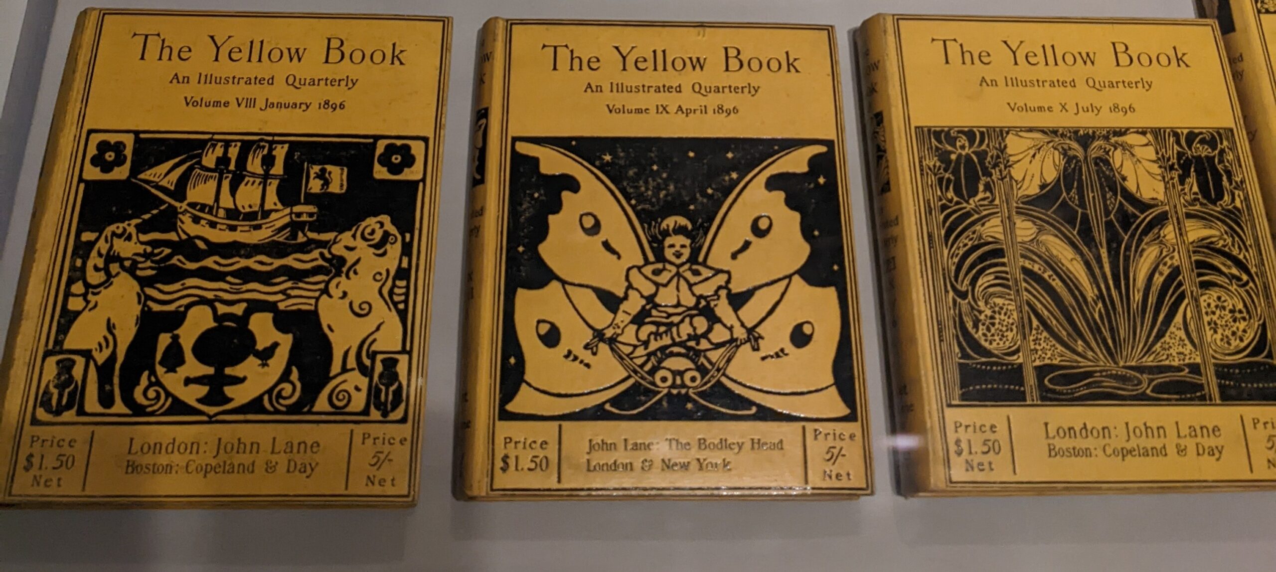 In the final section the tone of the exhibition changed, moving on to colour for colour’s sake as embraced by the Aesthetic and Decadent movements from the 1870s onwards. Oscar Wilde’s quote on the wall that read ‘Mere colour, unspoiled by meaning, and unallied with definite form, can speak to the soul in a thousand different ways’ expressed this sensory approach to colour and its undertones of queerness, subversiveness and cosmopolitanism. Focusing on certain colours and their late Victorian meanings worked well here. Yellow and green were the main colours that carried such connotations and dominated the palette of the fin de siècle avant-garde. Combined in Ramon Casa’s painting ‘Decadent Young Woman After the Dance’, an elegant Parisian woman lies exhausted on a green sofa with a yellow book at hand alluding to the yellow covers of French illicit novels. In Britain, this stylish and underground spirit was encapsulated by the periodical Yellow Book. Its yellow covers illustrated by Aubrey Beardsley’s vision of decadent femininity, also apparent in advertisements and posters, defined the so-called ‘Yellow Nineties’. Blue was used as a metaphor for male homosexuality in the cover of a rare copy of the In the Key of Blue book, the result of a collaboration between queer artists John Addington Symonds and Charles Ricketts.