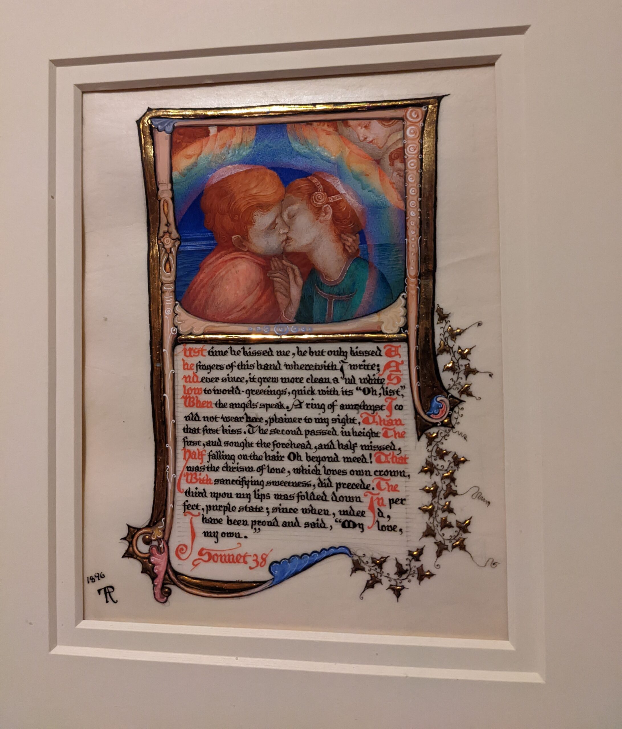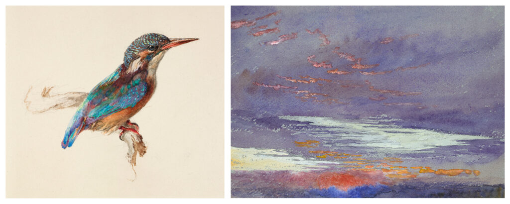 After this theatrical entrance, colour’s importance for the Victorians was introduced via the most influential art critic and thinker of the time, John Ruskin. Ruskin was the first Slade Professor of Fine Art at the University of Oxford, and he advocated the use of colour inspired by nature in his truth-seeking mission through art. This approach was shown by three beautiful watercolours on display side by side: two studies by Ruskin showed a vibrantly coloured kingfisher and dreamy purple clouds at dawn next to a painstakingly detailed gentian flower in ‘ineffable azure’ by Ruskin’s disciple John Brett. Ruskin also championed many British artists including the Pre-Raphaelites and most notably J M W Turner who he defended as the greatest colourist. Turner’s shimmering ‘Venice, from the porch of Madonna de la Salute’ on loan from New York’s Metropolitan Museum of Art and the lush red in John Everett Millais’ ‘The Woodman’s Daughter’ bore testament to both artists’ exceptional manipulation of colour. The latter painting, inspired by a medieval English poem, was part of the Victorians’ exploration of colour’s usage in their own past, dispelling the myth of the ‘Dark Ages’ as devoid of colour. Jane Morris’s embroidered wall hanging and Phoebe Anna Traquair’s illustration for Elizabeth Barrett Browning’s love sonnets were shown along with the medieval illuminated manuscripts that directly inspired them, and provided examples of how that ‘sacred’ study of medieval colour found outputs in different media.