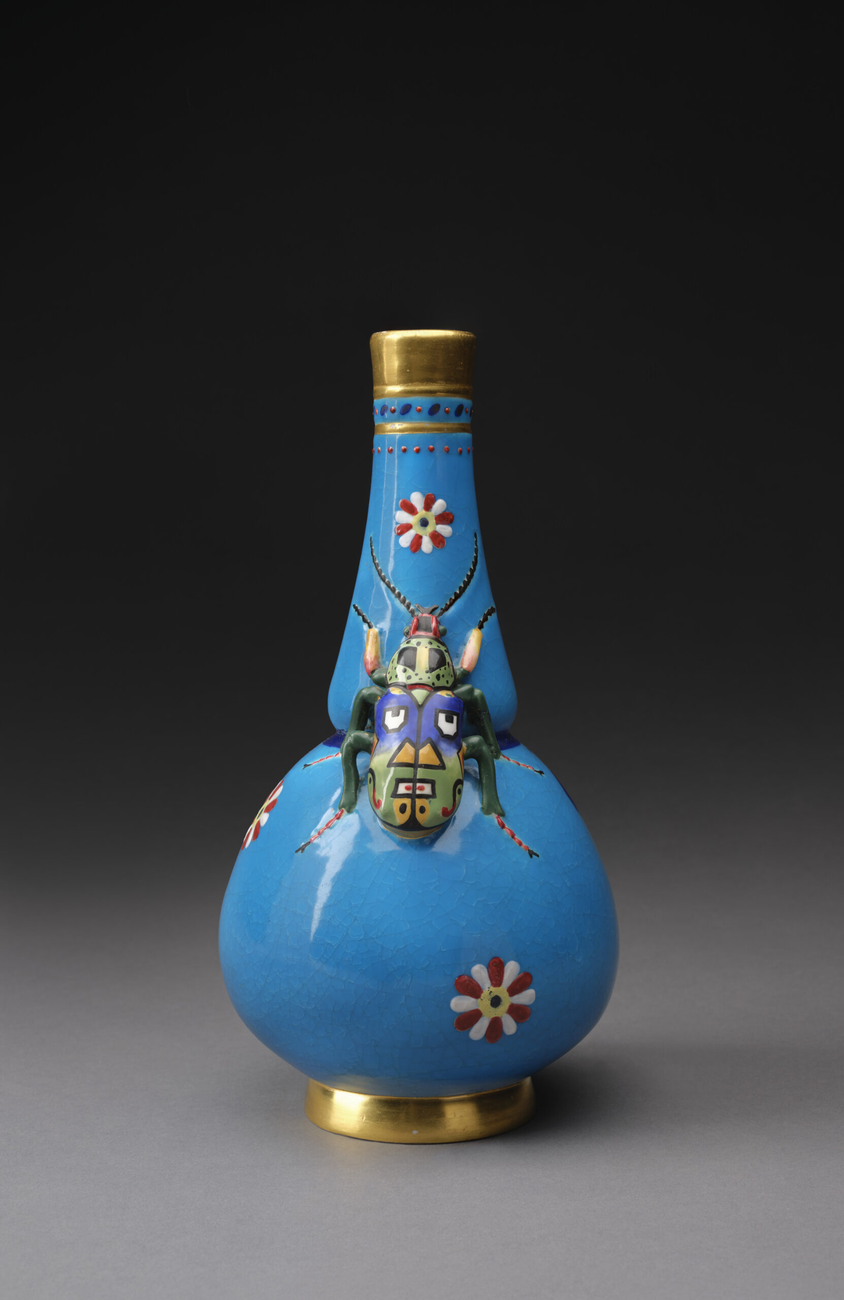 In contrast to the ‘sacred’ understanding of colour by Ruskin and the Pre-Raphaelites, the experiments of Victorian design reformers were shaped by scientific principles and particularly the growth of the natural sciences. A beetle vase by the reformist designer Christopher Dresser is a case in point. Although its bold colours are not realistic, they drew attention to the insect’s morphology being studied at the time by scientists under the microscope. The defining scientific theory about colour in the natural world was the most controversial. Charles Darwin’s evolutionary explanation of, for example, the role of iridescent feathers in sexual selection created heated debates about science demystifying nature, formed ideas of beauty and fuelled fashion crazes with destructive environmental effects. This was evidenced in the exhibition by a peculiar necklace made from decapitated heads of seven emerald and ruby topaz hummingbirds, nature’s most colourful animal according to the Victorians.