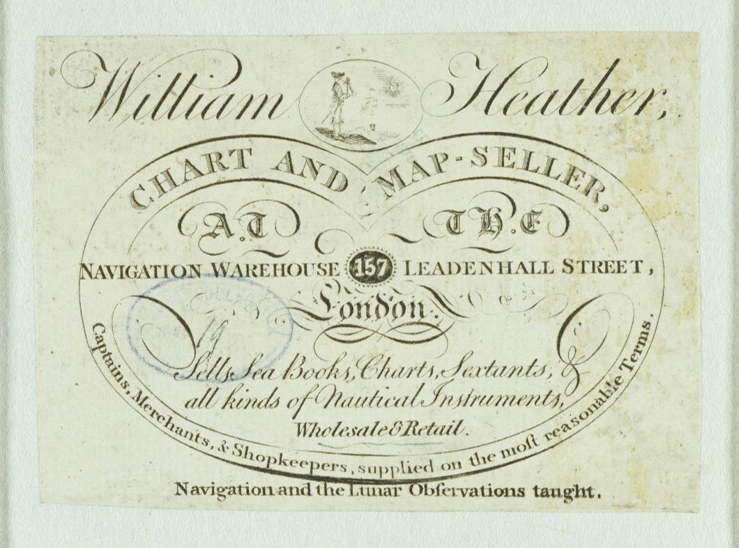 None of this material was supplied by the Company, as far as it is possible to tell – neither the instruction, nor the certification, logbooks, charts and instruments with which to put it to use at sea. What emerged instead was a string of businesses that set themselves up to supply the Company’s wants – or rather, the wants of the Company’s officers as generated by the Company’s requirements. In particular, we might note the emergence of the ‘navigation warehouse’ as a form of business in the late eighteenth century, which might be considered a manifestation of the increasing complexity of those requirements.