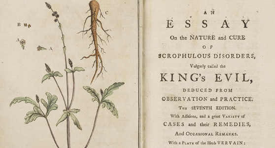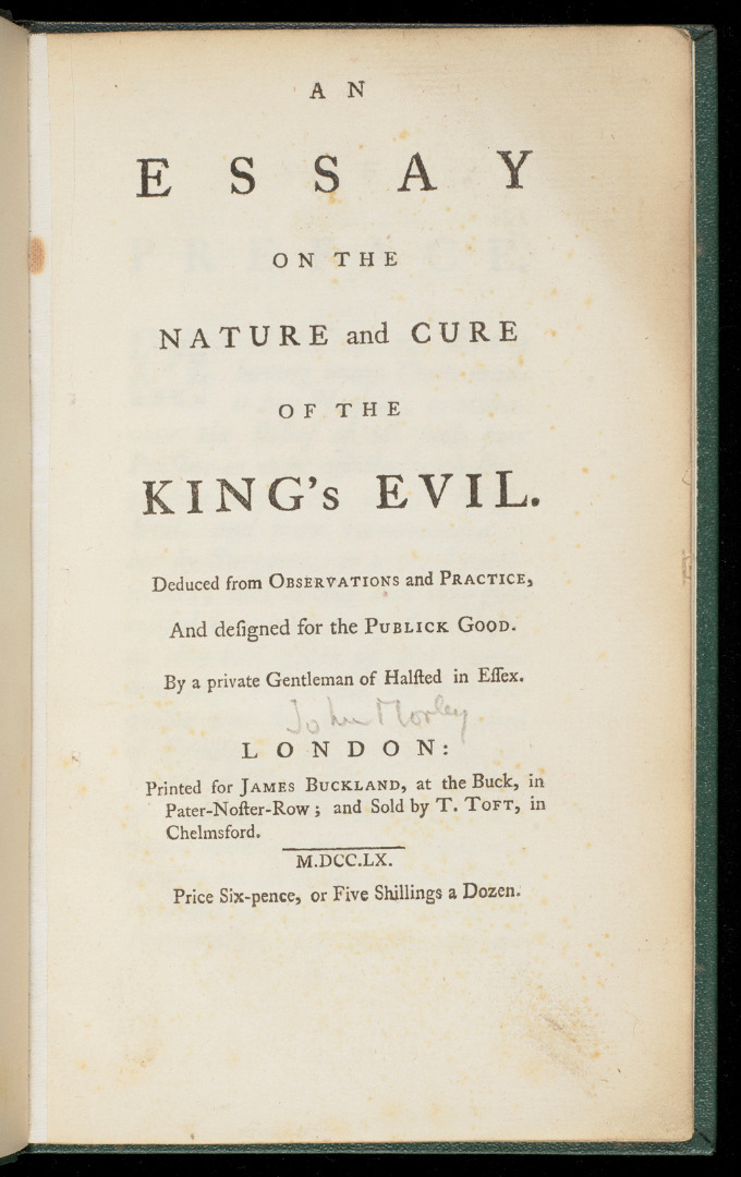 This article tells the story of an eighteenth-century medical pamphlet called An essay on the nature and cure of the King’s Evil, deduced from observation and practice. This was written by John Morley (d. 1776/7), a wealthy Essex landowner who advertised free medical treatments. The pamphlet is one of many short tracts on scrofula produced after the ceremony of ‘the royal touch’ ceased with the death of Queen Anne. However, it merits special attention from historians of medicine and historians of the book because it was edited and reprinted many more times than other surviving scrofula tracts: 42 editions appeared between 1760 and 1824. This suggests significant popularity.