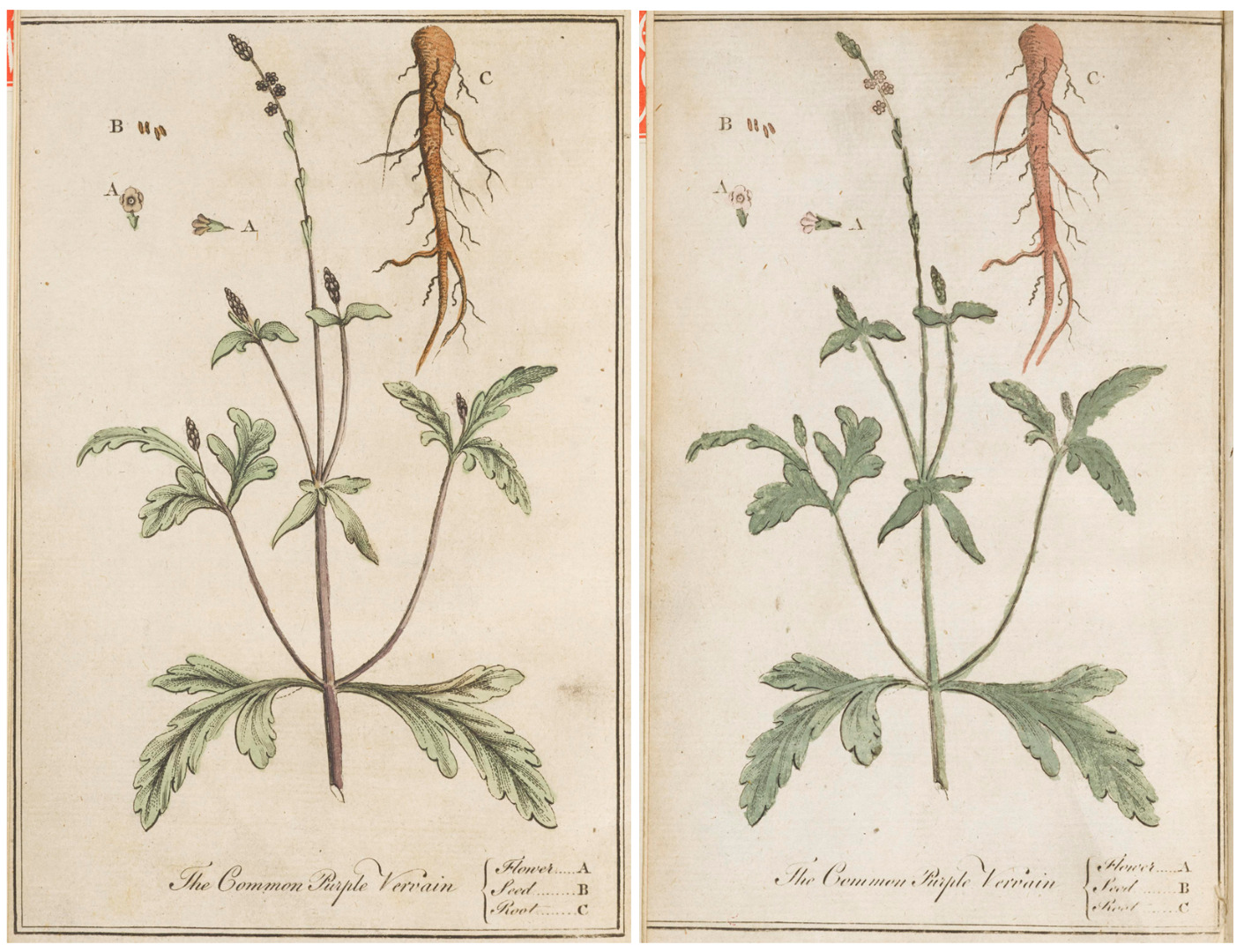 This intaglio print, which is normally inserted opposite the title page, contains no information about its drawer or engraver; like many eighteenth-century botanical images, it may have been copied from another work (Nickelsen, 2006, pp 185–228). In the print, the constituent parts of vervain are rendered through simple outlines; minimal detailing has been added to some of the leaves, the roots, and around the centres of the flowers, but otherwise there is little sense of depth, tone or texture. The quality of the colouring, which varies greatly from pamphlet to pamphlet, can exacerbate this flat, two-dimensional, diagrammatic quality: for example, in the copy of the fifteenth edition owned by the Science Museum, the colouring is far less careful and tonally sensitive than the colouring in the Museum’s copy of the seventh edition (see Figures 4 and 5). This lack of tone and detail means that the print would only have served as a basic guide for readers seeking to identify vervain by its shape and colour; the image would need to be supplemented by the written description Morley provided (Morley, 1766, p 17).[14]