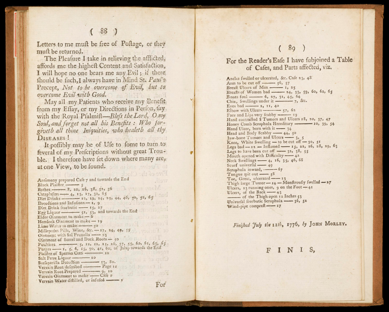 As well as recording readers using the Essay independently, Morley adds finding aids to the later editions which turn it into a better functioning tool for such independent use: in the eleventh edition, he adds an index which gives the page numbers of case studies associated with different body parts (Morley, 1774, pp 86–87). This index is appended to an earlier index (present from the ninth edition onwards) which lists case studies according to the various kinds of treatment deployed (plaster, diet drink, poultice, etc.). The body part index would have been much more useful than the treatment index to amateur, self-healing readers trying to match their unique collection of symptoms to those described in diverse cases. Along with the above reader testimonials, the index suggests that an increasingly infirm Morley was thinking more intently about how he might make the Essay into a self-healing aid capable of outliving him. There is a surprising resourcefulness here: whilst many pamphlets were ephemeral responses to particular controversies, events or (in the case of plague pamphlets) epidemics, Morley was trying to ensure that his pamphlet had a future beyond himself, even if he did claim right up until the fifteenth edition that it was better for patients to consult him in person than receive written instructions (Morley, 1776, p 84).