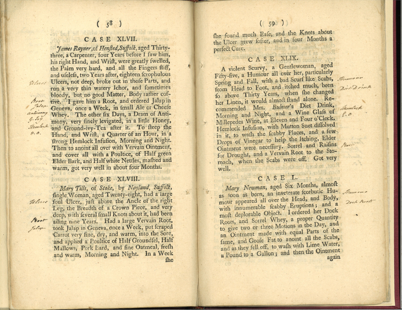 Sir, On reading your Essay, and recollecting what Dr. Lewis had said, of a cancerous Humour running withinside without any outward Appearance; I thought a scrophulous one might do the same […] The Vervain Root was then put on […] Then the Millepedes Pills, as in Case XVII, were given for her sore Throat […] Then she took the Antimony in fine powder, with Honey and Ground-ivy Tea, as in Case XLVII [..] she took the Diet Drink, as in Case XII, which quite removed that Complaint in a few Months.