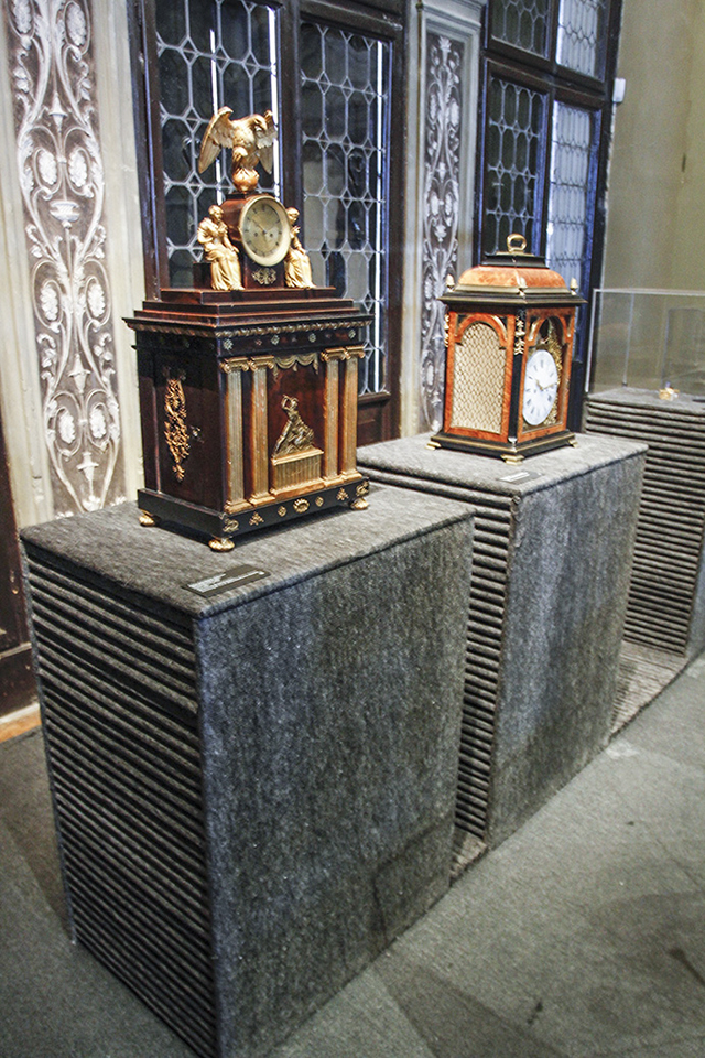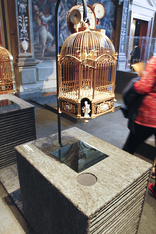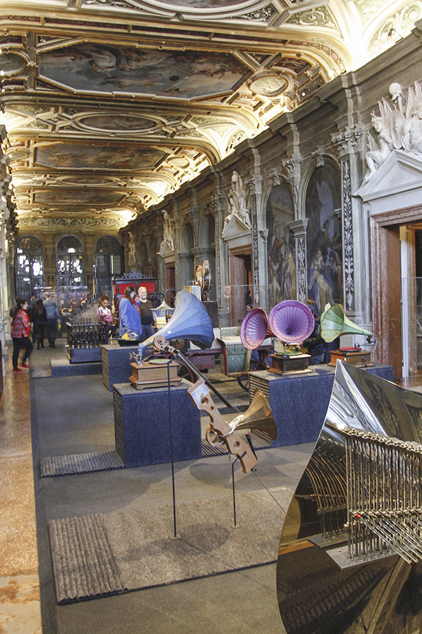 Setting aside the exhibition’s curatorial discretions that forego any pre-twenty-first-century contributions by non-western artists, Fondazione Prada’s Art or Sound appears to be the most successful of the above-mentioned exhibitions in terms of displaying sounds alongside their original sources, authentic historical physical objects. Several of the sculptures, instruments and decorative objects on display played their own sounds live into the gallery space and set up a tension between the sounds and their physical sources – which was the object: the sound or the material producing it? This type of display, while not perfect, approaches breaking new ground for the display of sounds as objects within a museological context. This success was the result of conceptual and technical aspects of the exhibition’s curation and design. The exhibition’s catalogue states that the sounding objects in the exhibition were treated with a quasi-musical intent, in the hopes that visitors would accept the sounds of multiple objects as parts of a whole rather than as intrusions upon each other. The exhibition’s installation included several sound-related design solutions, including cushioned plinths helping to isolate and absorb sounds (see Figures 4–6). As with any exhibition of sound taking place in a visual gallery space, there were inevitable areas of sonic conflict, but in terms of physical objects displayed as sounding objects, Art or Sound stands out as particularly successful in both concept and execution.