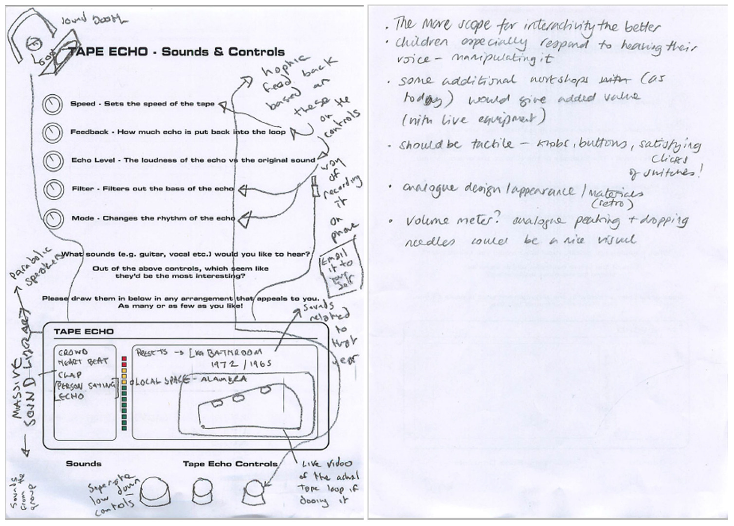 We also wanted our audience listeners to gain a sense of agency as listening experts aware of their role in curating imagined future museum exhibits. Although the professional collaborators would do much of the actual exhibit building, audience listeners had control over shaping the direction of the listening engagements they were involved in creating. In the case of Photophonic, the children advocated for the centrality of ‘jamming’ together as the key listening mechanism. In the case of the Echo listening group, Nina Richards designed an interactive workshop via an Ableton Live demo using an echo unit. As audience listeners explored and manipulated the interactive echo Ableton Live set, experiences, insights and engagements spun off into conversations and discussions about the future exhibit prototype (Figure 10). One listener mentioned that any future exhibit on echo should be “instantly fun”; another mentioned that due to the amount of touchscreen interfaces available in the present day, it was crucial to engage audiences in the physicality of manipulating the kinds of knobs and sliders present on the original echo units. During this phase, audience-listeners were invited to record their ideas through drawing and explaining their ideal interactive interface for an echo unit prototype exhibit (Figures 11 and 12). What seemed to capture the group’s imagination was the prospect of museum visitors performing with an echo effect exhibit and being overheard by others in the gallery. Having enjoyed the toasting experience led by MC Dee Bo General, they wanted to re-create something similarly social for the Museum. Their aspiration for the future museum was that it should be a place for sounding as well as listening.