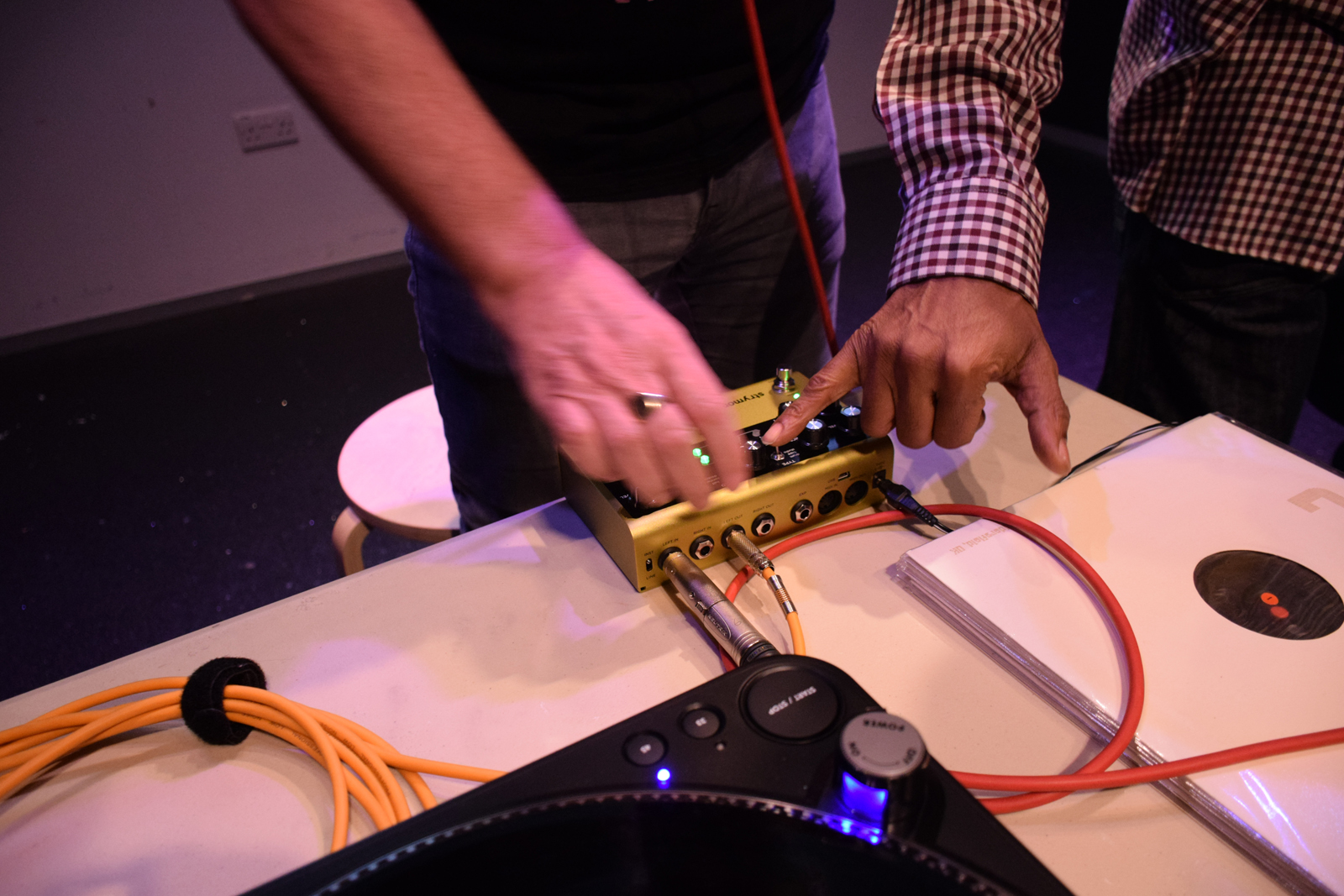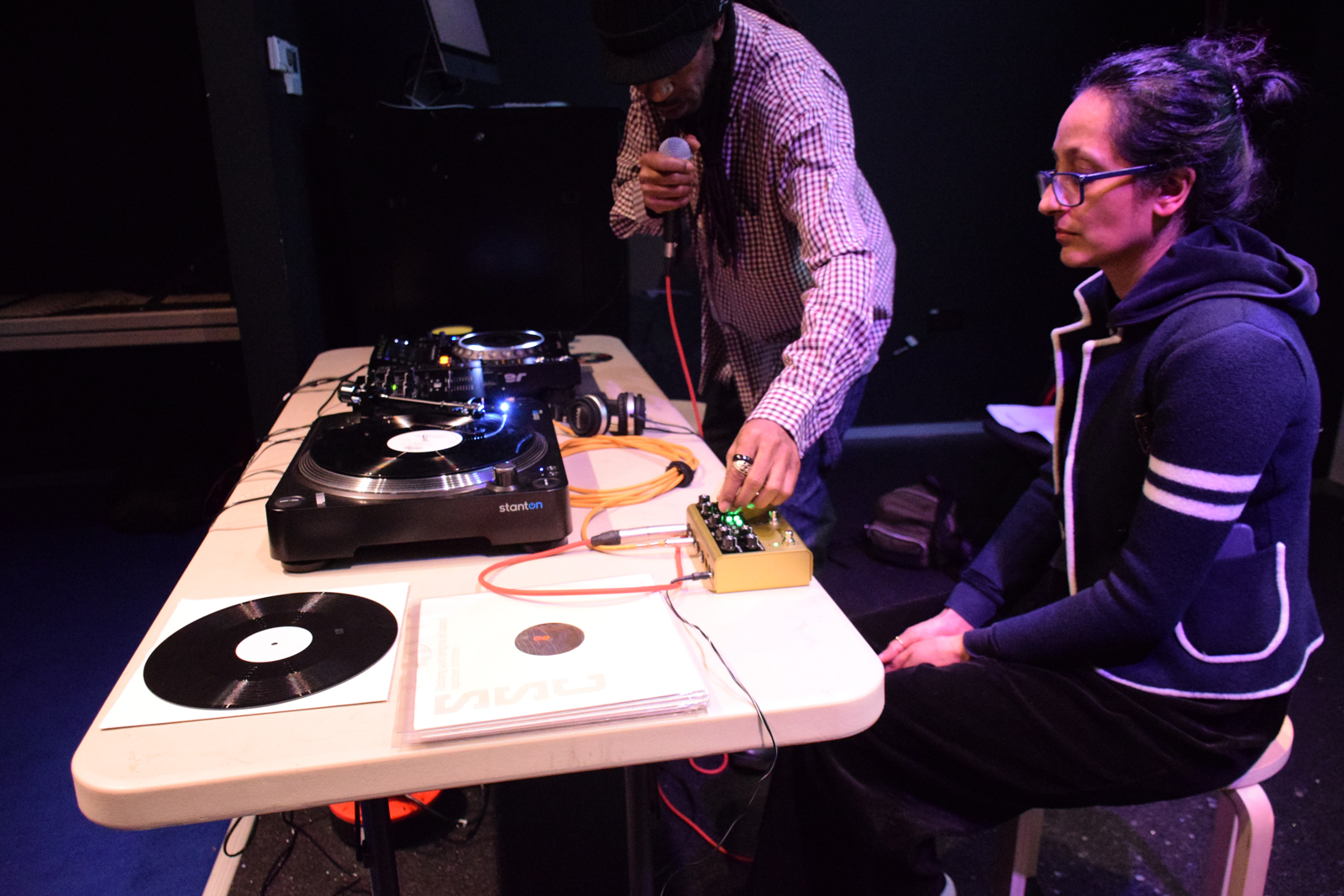 The audience group was invited to write their own rhymes and perform them to the rest of the group while deploying echo effects. Audience approaches to this challenge were varied, representing a diverse selection of creative and explorative approaches to the echo unit: one person chose to recount their experiences and memories of echo while manipulating their voice through the echo machine. Another person made a range of percussive mouth sounds and Dee Bo fed in with a range of suggestions for manipulating these sounds. Another member spoke into the mic to verbalise their exploration of the echo unit, reading out the names of the controls as they manipulated them. Their ‘toasting’ involved laughing as the music played and exclaiming “this is so much fun,” before breaking into song: “I’m a Jazz Woman […] I’m a Jazz woman […] I’m a Bradford woman […] I’m a BCB Woman.” (BCB stands for Bradford Community Broadcasting. Several members of the audience group were volunteers at this local community radio station.)
