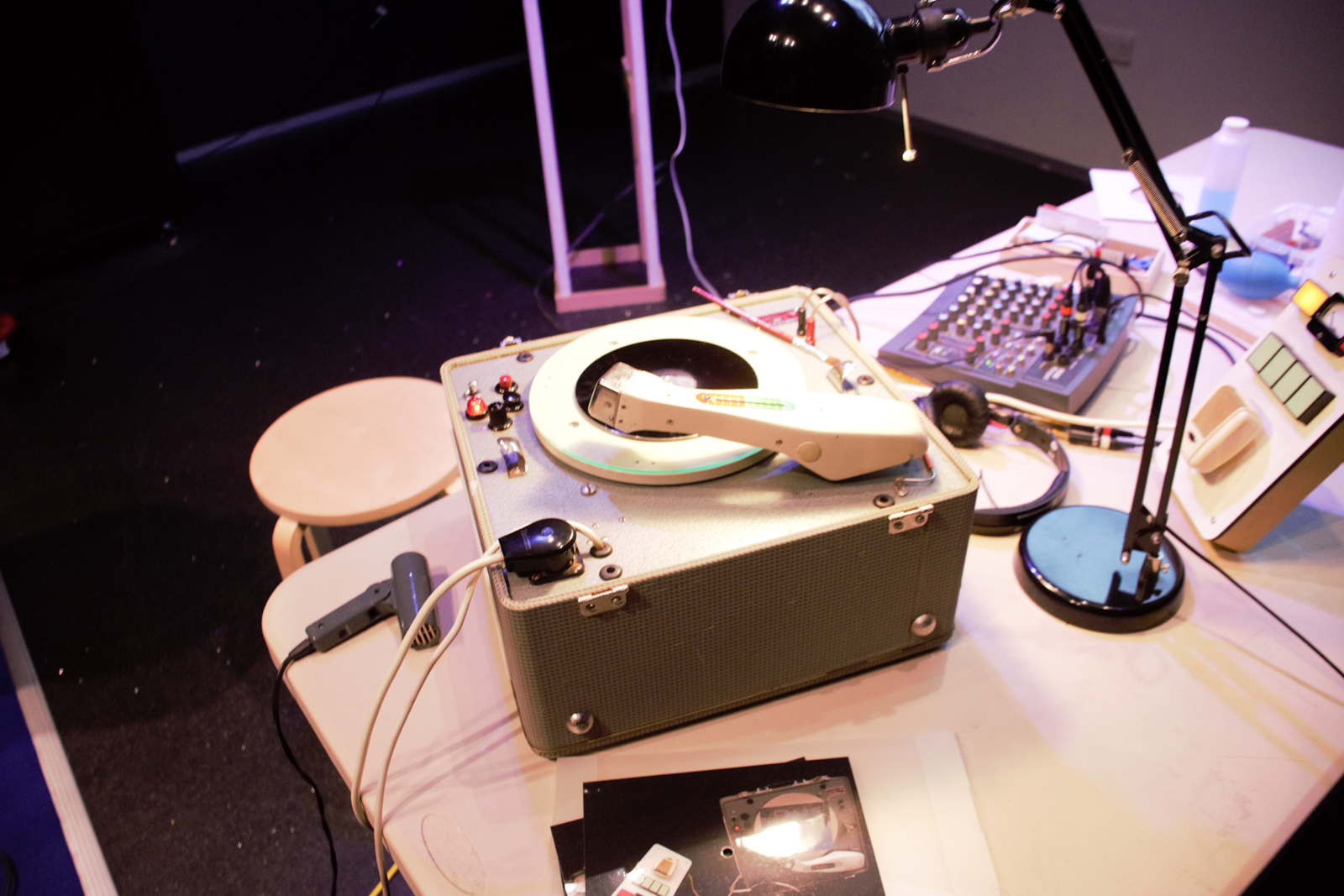 At the first Sound Postcards listening session Kolkowski introduced the group to a collection of vintage sound postcards (Figure 8) laid out beside a turntable and loudspeaker. On an adjacent table was an array of apparatus including a 1960s Cartavox vinyl lathe (Figure 9), a lamp, brushes, kitchen roll and a hairdryer. Tracking back to the turn of the twentieth century, Kolkowski gave a survey of early self-recording technologies, including the Phonopostale, a self-recorded sound-postcard medium originating in France, and voice records that would have been recorded in coin-slot operated booths and either cut onto metal or lacquer disc. Moving on to sound postcards that were cut in their thousands as souvenirs, pop music recordings or commemorations, Kolkowski played such editions as ‘Sights and Sounds of Canterbury’ and a 1981 Charles and Diana wedding commemoration postcard (Figure 10). Kolkowski touched on the clandestine use of sound postcards in Eastern Bloc countries in the Soviet Era as a means to proliferate contraband recordings of western pop music. He then introduced the 1960s Cartavox recording machine. Completely automatic, and with a colourful, retro-futuristic interface, the machine had a short-lived life as a domestic technology that allowed users to record their own sound postcard from a live recording. Kolkowski went about engaging audience-listeners in creating a series of instantaneous disc recordings onto blank sound postcards. First, as he warmed a blank disc with a hair dryer, the group were assembled in a V shape around a microphone to make a 90-second crowd sound recording. Firing up the Cartavox, Kolkowski engaged the group to make a series of animated jibber-jabber sounds beginning softly and slowly swelling in volume until they reached cacophony. As these sounds were emitted, Kolkowski stood over the machine with a swarf brush, industriously clearing the hair-like strands of vinyl produced by the cutting process. When the recording ended, Kolkowski blew the swarf away from the disc, placed it on the vinyl deck and played it back to the group. Audience listeners watched the disc spinning on the deck, audibly animated to hear their sounds replicated through this antiquated technology, heard as though they were returning from the past. The group examined the marks left by their voices on the acetate during the recording process, running fingers over the imprints and feeling the materiality of their sonic signatures on the medium.