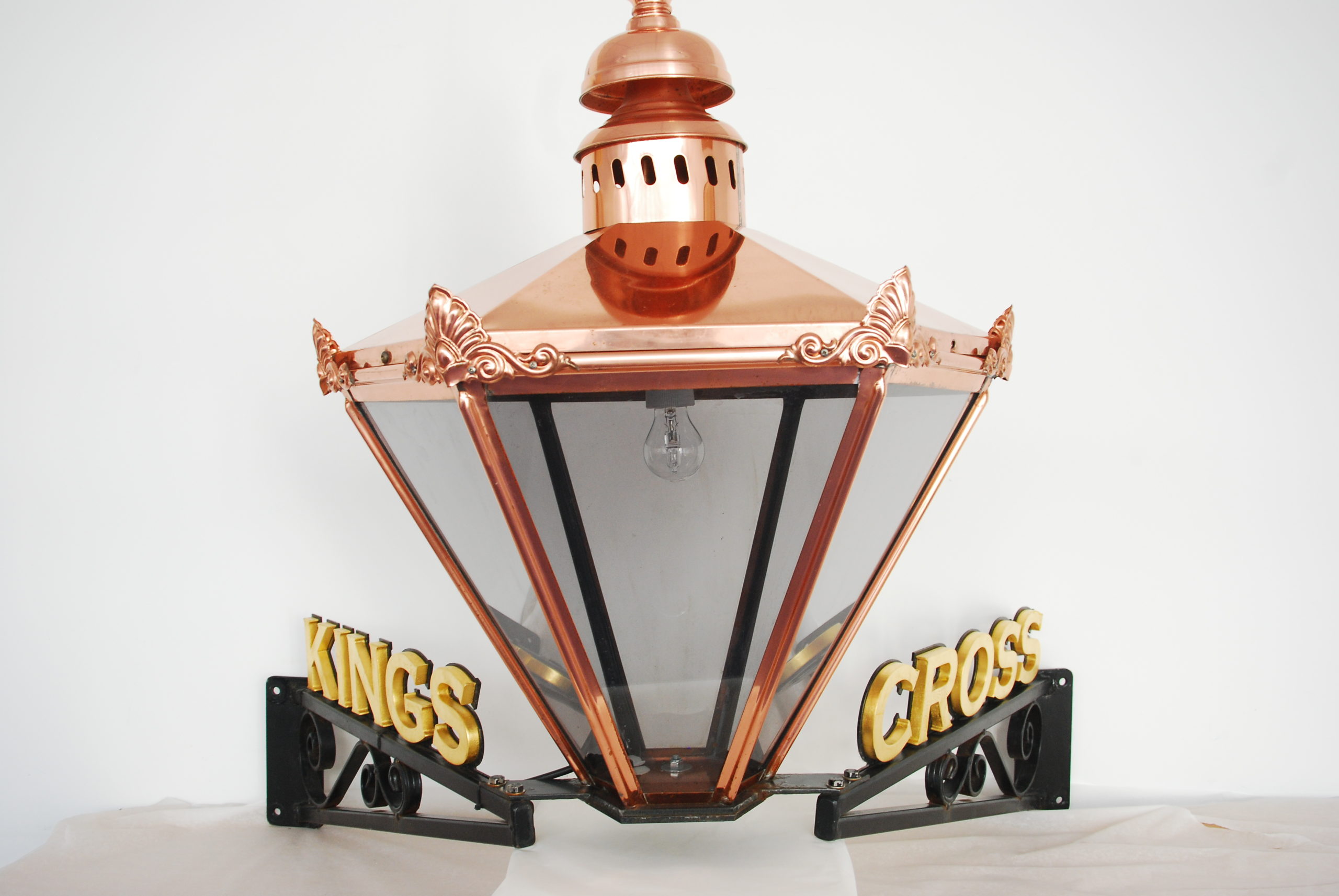 Copper, Victorian style lamp with ‘KINGS CROSS’, gold in colour, on a black metal bracket. This lamp used to hang above the entrance to the Kings Cross pub in the City Centre. The Kings Cross pub attracted the LGBTQ+ community from the 1970s until its closure in 2010.[14]