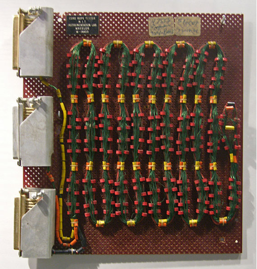 Another interesting case I found was that of the rope core memory, the first read-only memory for computers, initially developed and used by early NASA Mars space probes and then in the Apollo Guidance Computer (AGC) and programmed by the Massachusetts Institute of Technology (MIT) Instrumentation Lab. The technical specificities of rope memory reveal, among other things, the very material and technical aspects of memory as a data storage device: “Bits of information are presented by threads of wire and tiny doughnut-shaped magnetic cores. A core with wire threaded through the centre represents 1, an empty core represents 0. In this way, the pattern of wires can form a computer programme – software crystallized as hardware, in other words” (Brock , 2017). What I found exciting in this story of the rope memory was one gendered moment in the history of computing and in memory studies, broadly conceived: software written by MIT programmers was woven into core rope memory by female workers in factories, and the final product was thus named ‘LOL memory’, for Little Old Lady memory (Figure 8).